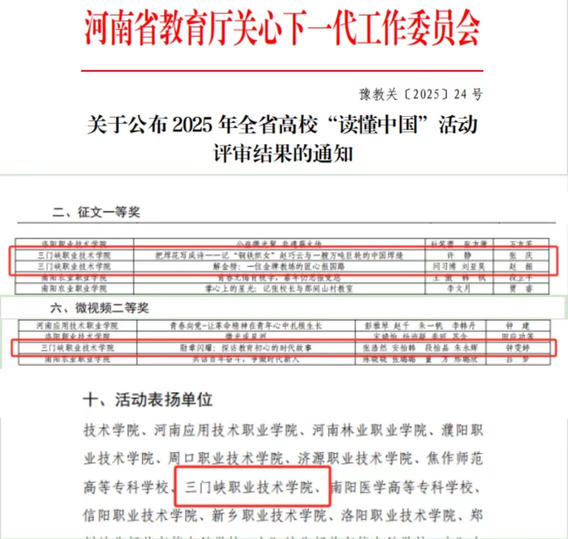 近日,河南省教育厅关心下一代工作委员会公布2025年“读懂中国”活动评审结果。学院师生凭借深厚的人文素养、创新的创作思路与真挚的家国情怀,在征文、微视频赛道中斩获一等奖2项、二等奖1项,充分展现出学院依托“大思政课”实践育人平台,推动思想政治教育走深走实的扎实成效。