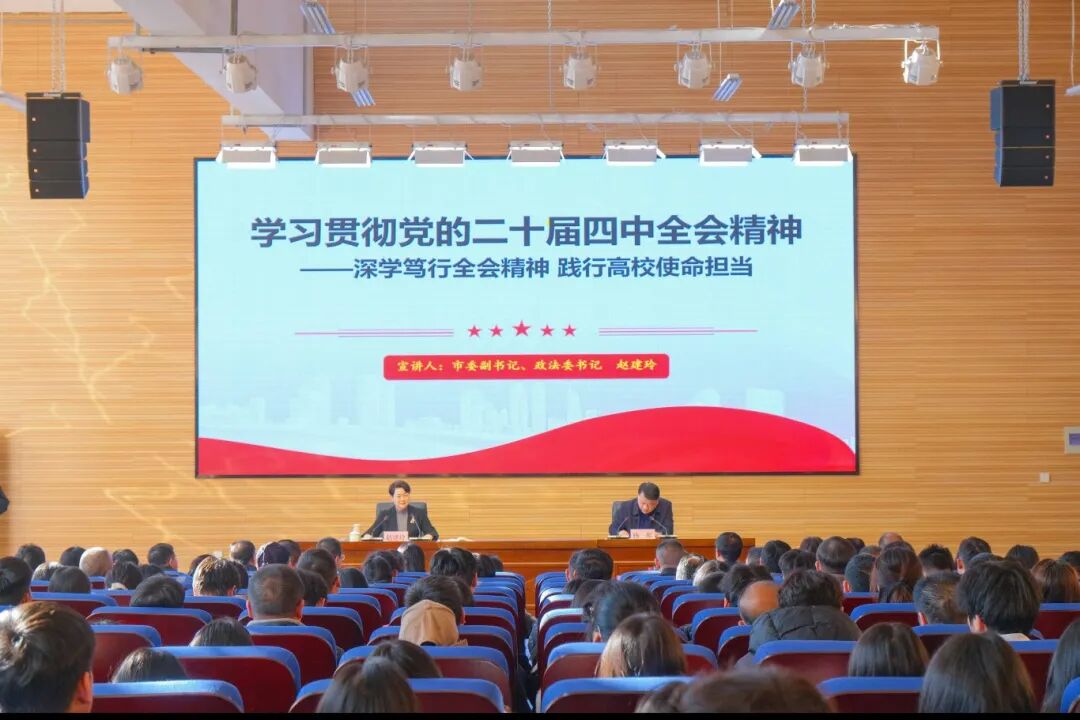为推动党的二十届四中全会精神落地生根、深入人心,12月17日,三门峡市委副书记、政法委书记赵建玲为学院师生代表讲授专题思政课,深入解读全会精神核心要义。市委办公室副主任刘燕妮出席。活动由学院党委书记杨彤主持。