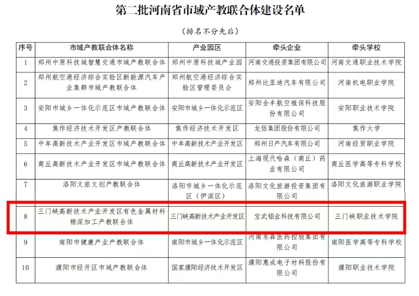 近日,河南省教育厅印发《河南省教育厅办公室关于开展第二批河南省市域产教联合体建设的通知》(教办职成〔2025〕229号),前期经园区申报、地方推荐、专家评审、网上公示等环节,由我院和三门峡高新技术产业开发区、宝武铝业科技有限公司牵头组建的“三门峡高新技术产业开发区有色金属材料精深加工产教联合体”成功获批,这是继我院获得“全省首批产教融合共同体”后的又一重要荣誉,标志学院持续深化现代职业教育体系建设改革取得又一实质性突破。