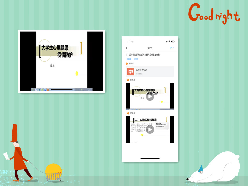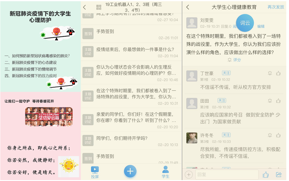 “我们坚信有爱就会赢,无法拥抱却离你最近。真情守望,长江黄河水流长,我们凝聚起中华民族的力量……”在刘雯雯老师《大学生心理健康教育》课程的课堂上,一首《坚信爱会赢》开启了新学期的开学第一课。《新冠肺炎疫情下的大学生心理防护》是刘老师开学第一课和同学们分享的主题。本堂课从四个方面展开教学:一、如何预防新型冠状病毒感染的肺炎?二、新冠肺炎疫情下的心态建设;三、新冠肺炎疫情下的情绪调节;四、新冠肺炎疫情下的压力应对。不同于以往的寒假开学季,非传统的网络授课模式,但正如“隔离病毒,但不隔离爱”,虽不能返校,但我们的课程如约在线,教与学的本质没有变,教书育人的初心没有变,并将在一段时期内陪伴同学们收获内心的平静与安宁。“让我们一起守护,等待春暖花开”!