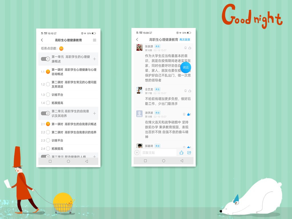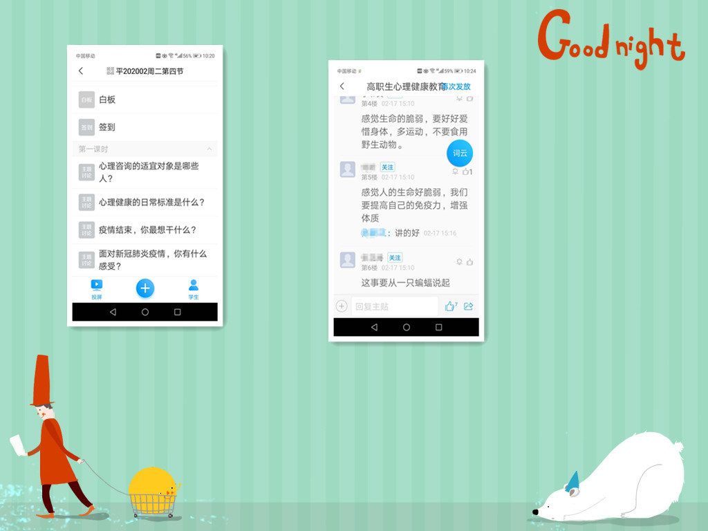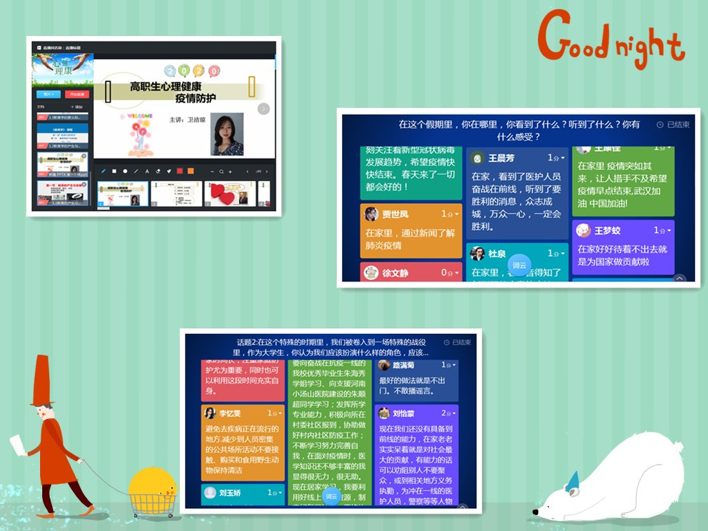 学生在哪里,我们的阵地就在哪里。不管遇到什么样的困难,我们都应和学生在一起。微信公众号、微信工作群、QQ 工作群、微博、博客都是我们的工作场所,心理健康课就是我们的主战场。“一平三端”学习通、钉钉软件下载、培训、学习,制作课件、录播、直播成了每天的主旋律,讨论抢答、线上作业批改、红包奖励,一天结束,心情美美哒。除此之外,利用心理委员群征求学生网上学习的情况,不断改进、完善教学手段,通过电话、QQ、微信对学生进行心理援助,真是一个没有假期的假期。