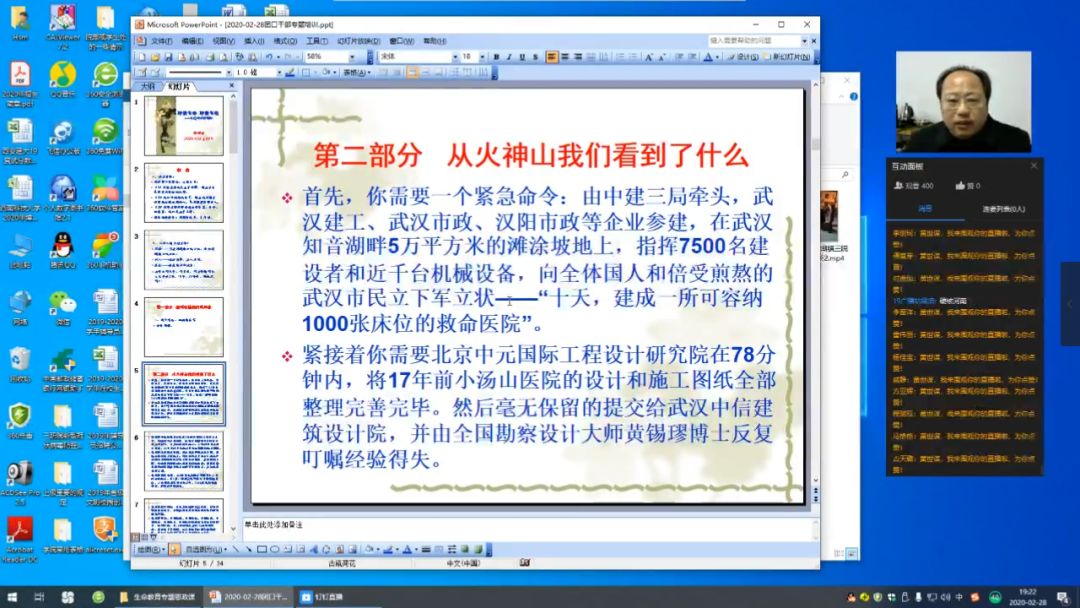 创建团课网络直播新平台,搭建起共青团网络战斗新阵地,是院团委在新冠肺炎疫情战役中创新共青团工作的新模式。此次团课分为四个部分,分别是:第一部分,面对疫情我们的思索;第二部分,从火神山我们看到了什么;第三部分,从疫情中我们对生命的反思;第四部分,疫情后大学生应该怎么做。黄世谋教授结合多年的学生管理经验和自己对疫情的感悟,通过PPT、视频进行讲解,让大家看到疫情之下,中国共产党的坚强领导作用,中国特色社会主义制度和国家治理体系的显著优势,希望广大团员青年要正确的看待疫情,珍惜生命,珍爱生活,加强学习,提高素质,增强爱国主义情怀和社会责任感,不断坚定理想信念,牢固树立社会主义核心价值观。最后,黄世谋教授与同学们在线交流讨论,针对团员青年提出的问题释疑解惑,为大家上了一堂生动、有温度、有深度的网上主题团课。