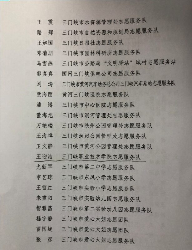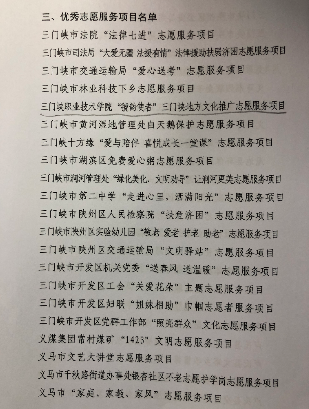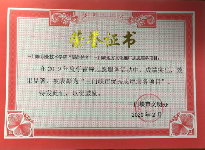 2019年三门峡市文明办在全市开展了学雷锋志愿服务“四个一批”先进典型推选活动,近日,市文明办发布《关于表彰2019年度三门峡市学雷锋志愿服务“四个一批”先进典型名单的决定》(三文明〔2020〕3号)。学院教师王迎洁荣获三门峡市“优秀志愿服务者”,学院“虢韵使者”三门峡地方文化推广志愿服务项目荣获三门峡市“优秀志愿服务项目”。
