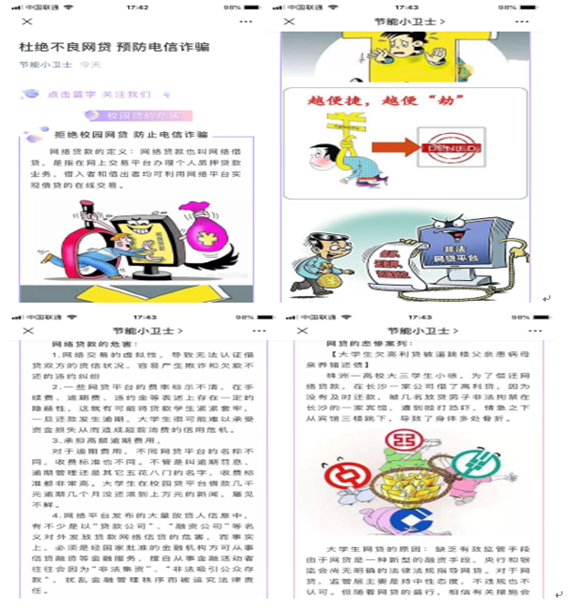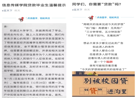 为了让贷款毕业生遵守承诺,按时还款,而且在日常生活中时时处处弘扬诚实守信的道德准则,把良好的学风、校风带到工作中去,努力提高思想道德素质,促进自身全面健康发展。各院部利用钉钉、微信群、公众号等新媒体平台,积极组织2020届贷款毕业生进行线上诚信教育班会,按照要求做好国家助学贷款毕业生资料确认,告知毕业生还款相关流程。毕业班辅导员结合学生生活、就业等实际情况,通过诚信教育班会,告知贷款学生还款知识、逾期违约后果等,使诚信理念深入学生内心,毕业后自觉履行还款义务。同时建立健全了贷款毕业生沟通机制。通过电话、微信群、QQ群、钉钉群等多种方式与贷款毕业生建立良好的沟通渠道。