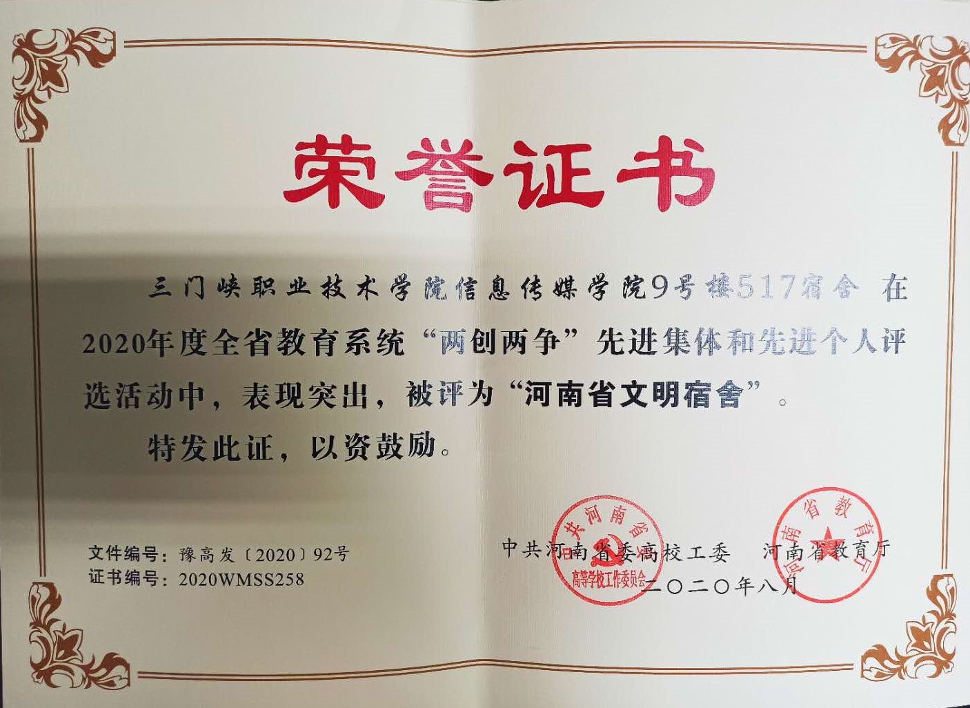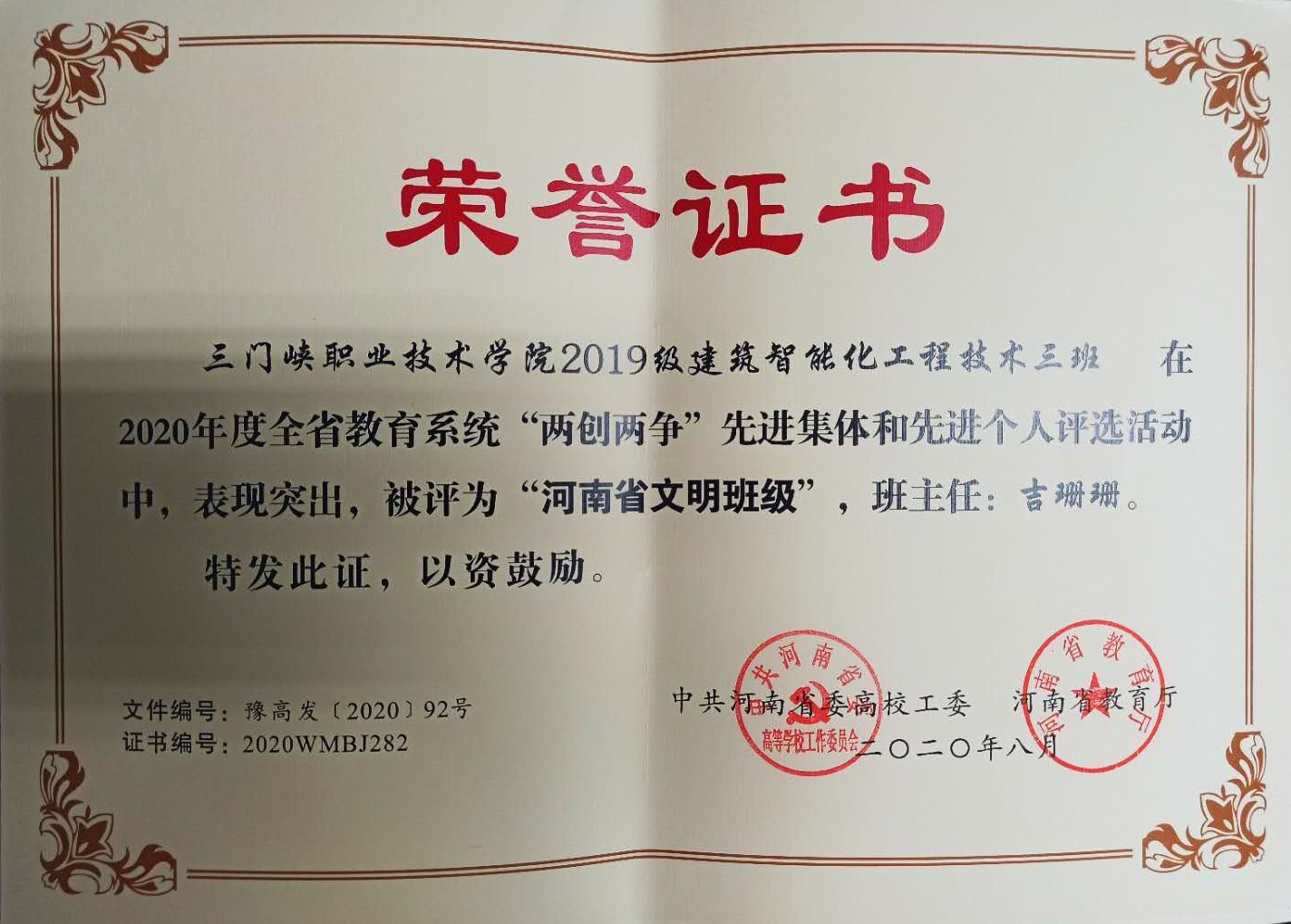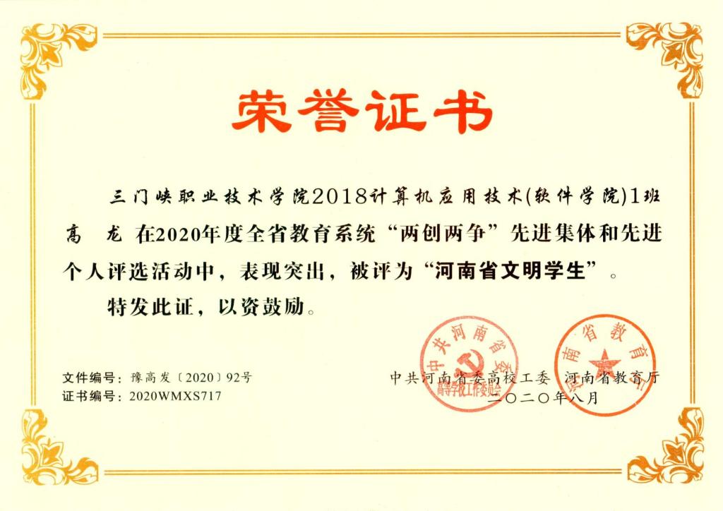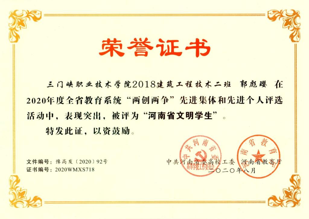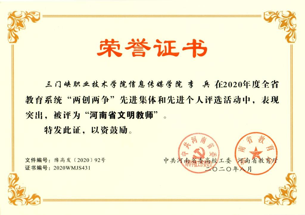 近日,中共河南省委高校工委、河南省教育厅下发通知,公布2020年度全省教育系统“两创两争”活动先进集体和先进个人评选结果。我院智能制造学院吴萍、信息传媒学院李兵获评“河南省文明教师”荣誉称号,2018级计算机应用技术(软件学院)1班高龙、2018级建筑工程技术2班郭彪璎获评“河南省文明学生”荣誉称号,信息传媒学院9号楼517宿舍获评“河南省文明宿舍”荣誉称号,2019级建筑智能化工程技术三班获评“河南省文明班级”荣誉称号。
