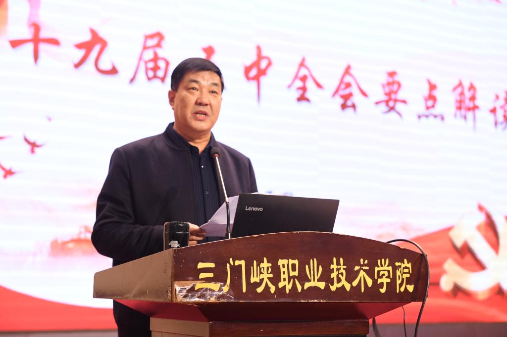 吴勇军详细解读了十九届五中全会精神,从战略、战术和条件保障三个维度解读《十四个五年规划和二〇三五年远景目标的建议》的内涵,他详细阐释了我国决胜全面建成小康社会取得决定性成就、我国发展环境面临深刻复杂变化、到2035年要实现的远景目标、“十四五”时期经济社会发展的指导原则和“十四五”时间经济社会发展的主要目标等内容,重点讲解了如何开启建设社会主义现代化国家新征程,如何做好今后12项重点工作任务,如何强化领导、凝心聚力、营造环境,获取全面建设社会主义现代化国家新胜利等要点。他还紧密结合国家职业教育改革、科技创新发展和服务地方经济等方面深入分析了“十四五”期间国家发展规划以及学院未来发展的大格局,对教职工深刻认识和理解全会精神具有很强的启发性和指导性。