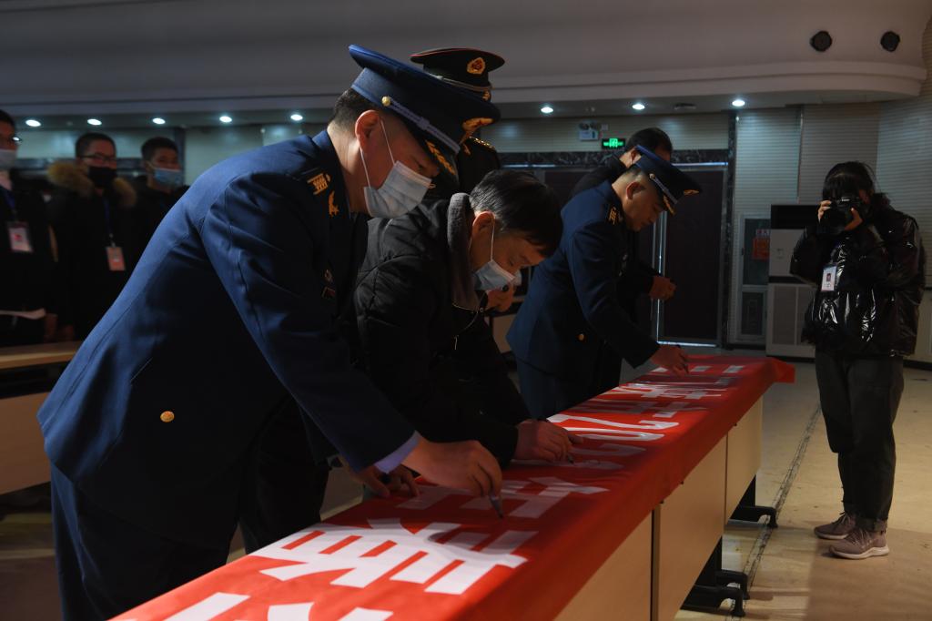 仪式结束后,与会领导与七百余名大学生在征兵宣传条幅上签名,共唱《歌唱祖国》。