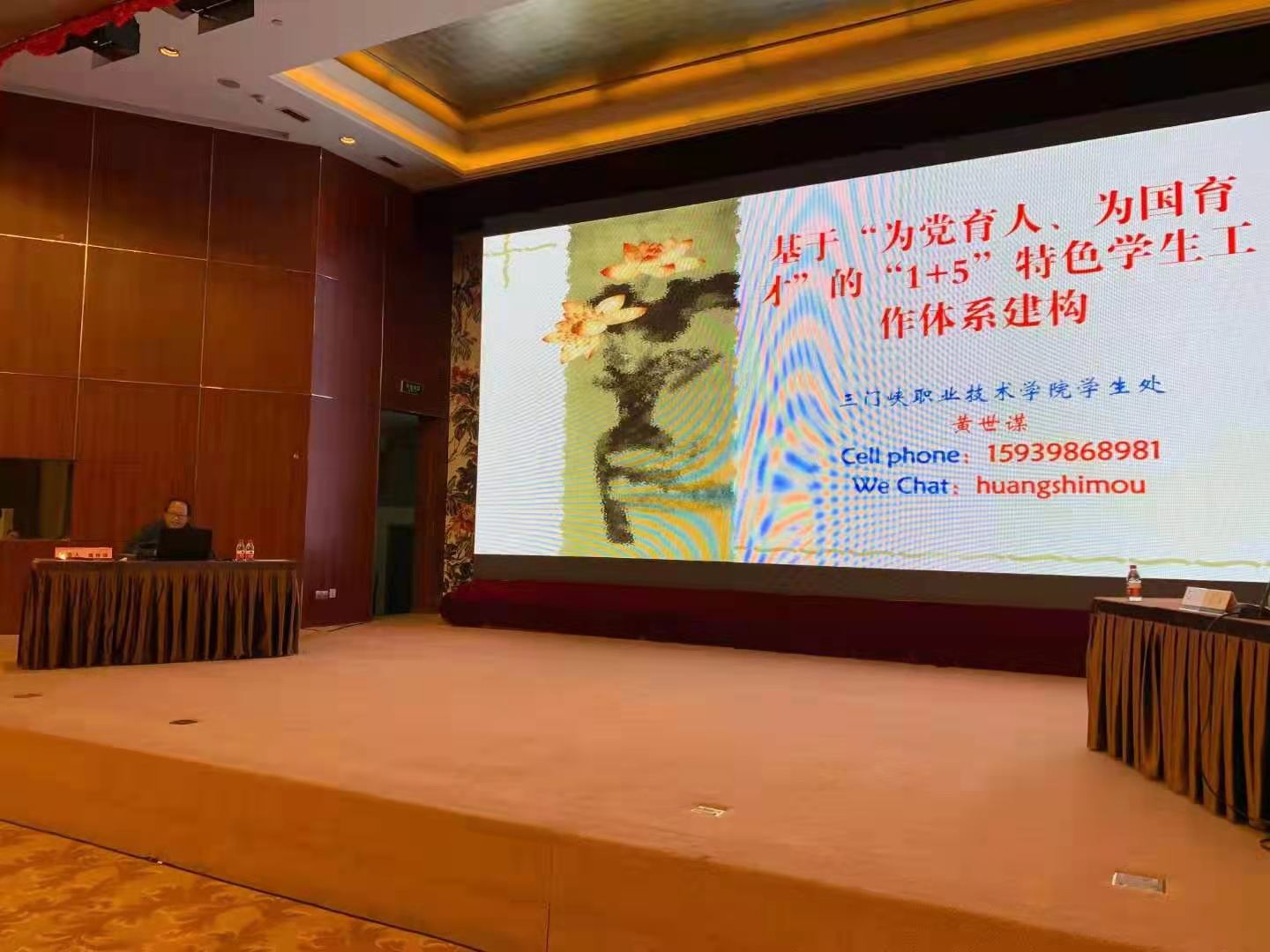 黄世谋以《基于“为党育人,为国育才”的“1+5”特色学生工作体系建构》为题,针对我院特色学生工作体系做了专题分享报告。在报告中,黄世谋介绍了三门峡市和我院的基本情况及我院的办学思路和学生工作理念,重点介绍了我院基于“为党育人,为国育才”人才培养目标,以思想政治工作体系为核,以文化育人体系、校园文化工作体系、创新创业工作体系、心理健康教育工作体系、应征入伍工作体系为环的“1+5”特色学生工作体系,得到了与会领导和专家的广泛好评。
