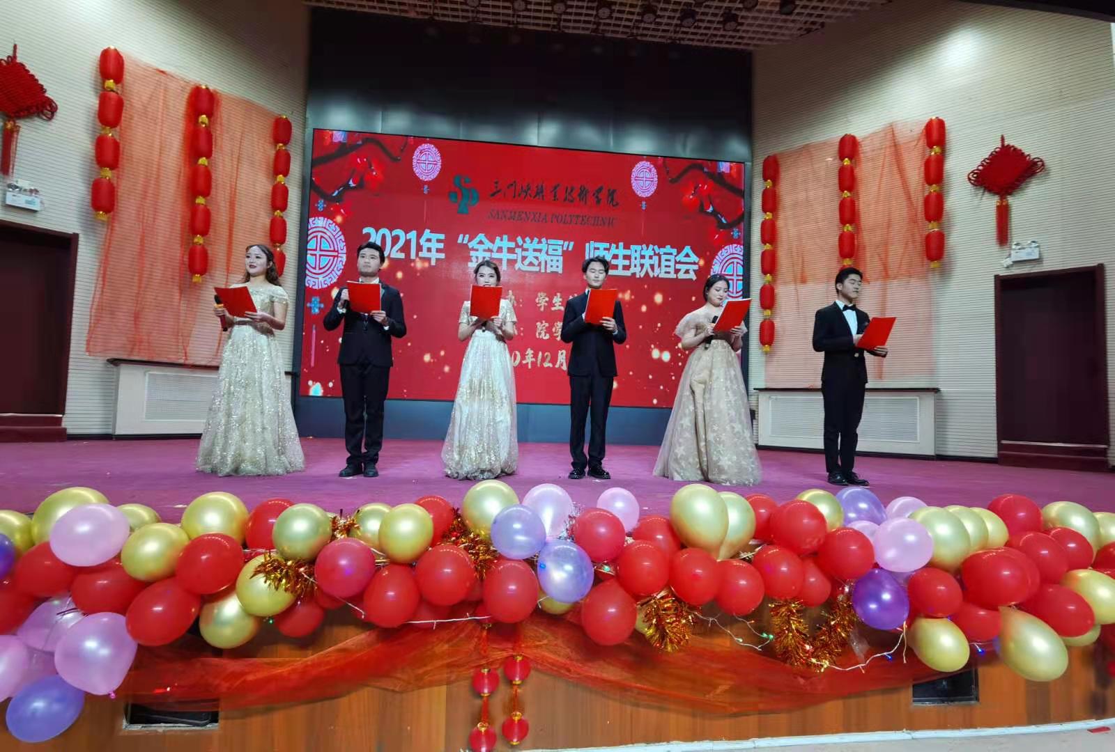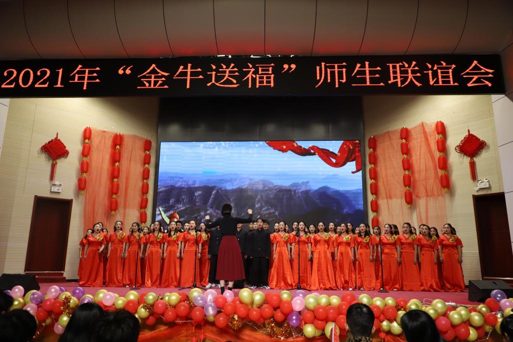 为加强我院青年学生的社会主义先进文化教育,构建良好地校园文化氛围,12月29日,由学生处主办、院学生会承办的2021年“金牛送福”师生联谊会在学术报告厅举行。党委委员、副院长马旭东,党委委员、组宣部部长侯玲玲,学工部部长、学生处处长黄世谋,学工部副部长、学生处副处长刘学文,学生处副处长曲扬,各院部学生科科长、学生处全体工作人员以及我院千余名学生代表观看了晚会。