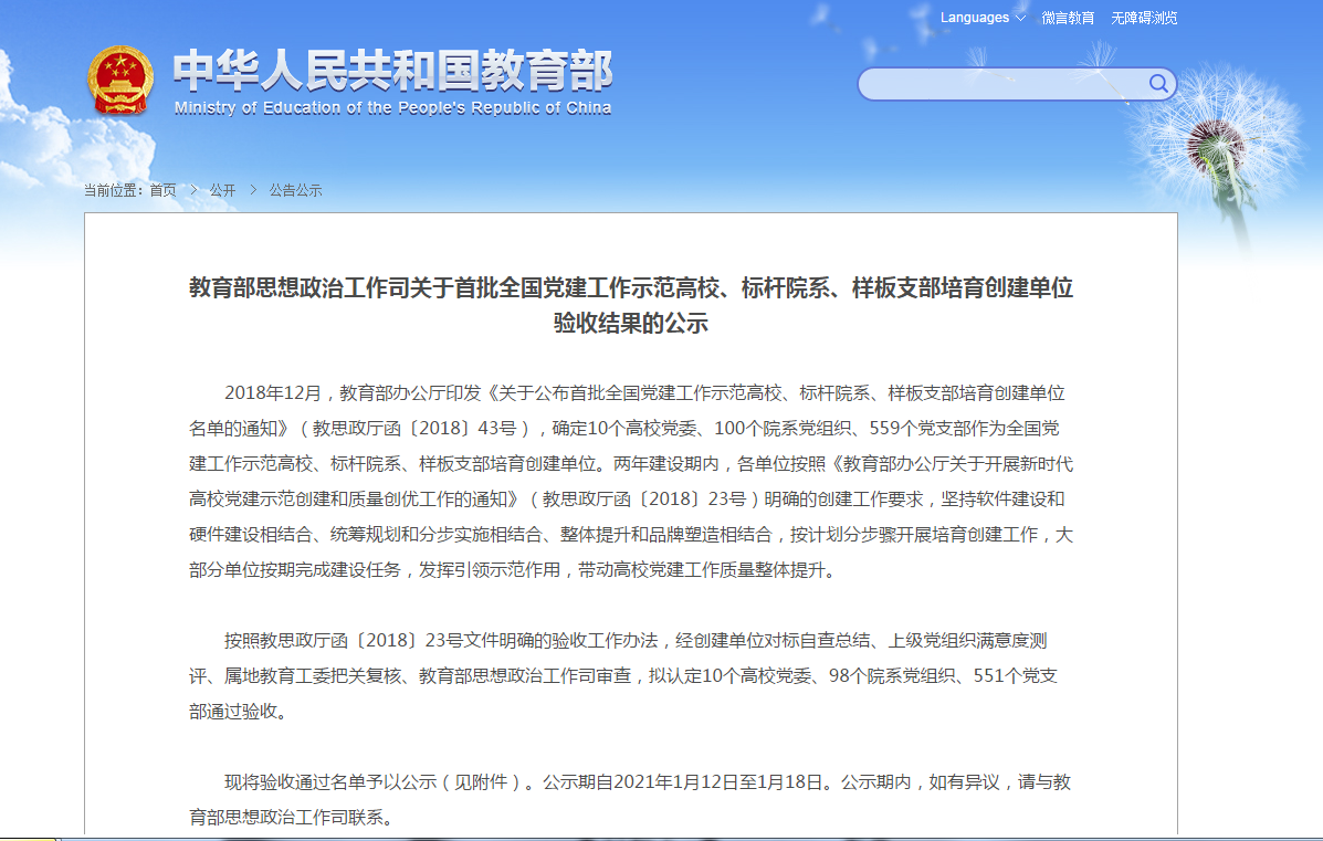 近日,教育部公示首批全国党建工作示范高校、标杆院系、样板支部培育创建单位验收结果,学院公共教学部教工党支部通过首批“全国党建工作样板支部”培育创建单位验收。