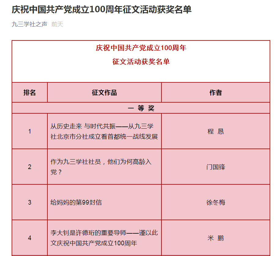 据悉,此次主题征文活动是九三学社中央为庆祝中国共产党成立100周年,深入推进党史学习教育的一项重要举措,自2021年2月开展以来,共收到各类征文作品260篇,经过评审委员会两次网络评审,按综合评分由高到低选取前100名进行表彰,卞建宁撰写的《九三学社与中国共产党亲密合作的历史脉络探析》文章在全国征文作品中综合评分为第43位,被评为三等奖。论文深入分析了九三学社与中国共产党在不同历史时期亲密合作的历史过程,并从历史的发展中得出结论:心系国家民族前途的价值共识,决定了九三学社自成立之日起,就与中国共产党有着密不可分的联系;坚持自觉接受中国共产党领导,坚定不移走中国特色社会主义政治发展道路,是九三学社先贤们经过认真思考和反复比较做出的重要抉择,是中国共产党领导的多党合作制度建立的初心所在。