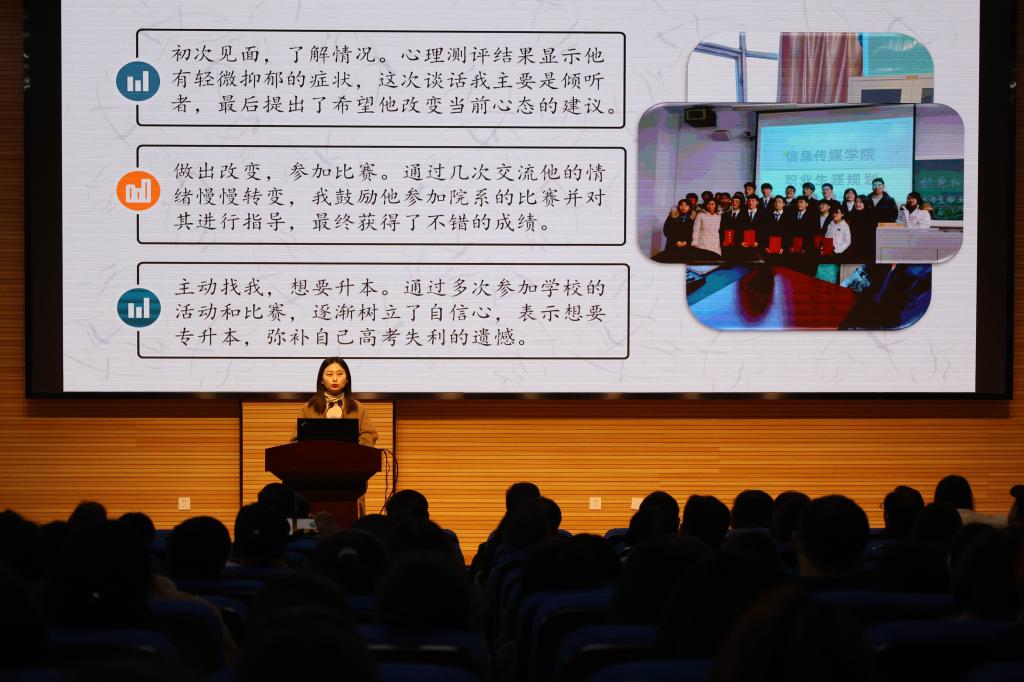 经过前期选拔,本次演讲展示环节共有10名辅导员参赛,他们个个精神饱满、信心十足,演讲紧扣主题,围绕党的十九届六中全会精神、习近平总书记“七一”重要讲话精神等内容,结合当前社会热点、国内外时事,通过讲政策、讲理论、讲案例的方式,为广大师生上了一场灵活生动、内容丰富的思想政治理论课。一张张制作精美的PPT,图文并茂、内容翔实,涵盖思想教育、公寓管理、心理健康、学生资助、传统文化教育等方面,为大家展示了新时代辅导员视学生如亲人,与学生共成长,与学生共进步的青春风采。