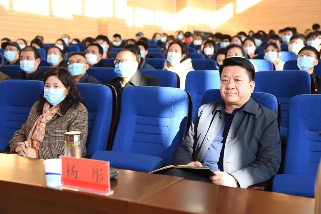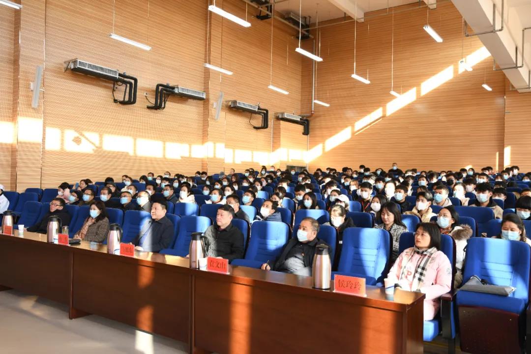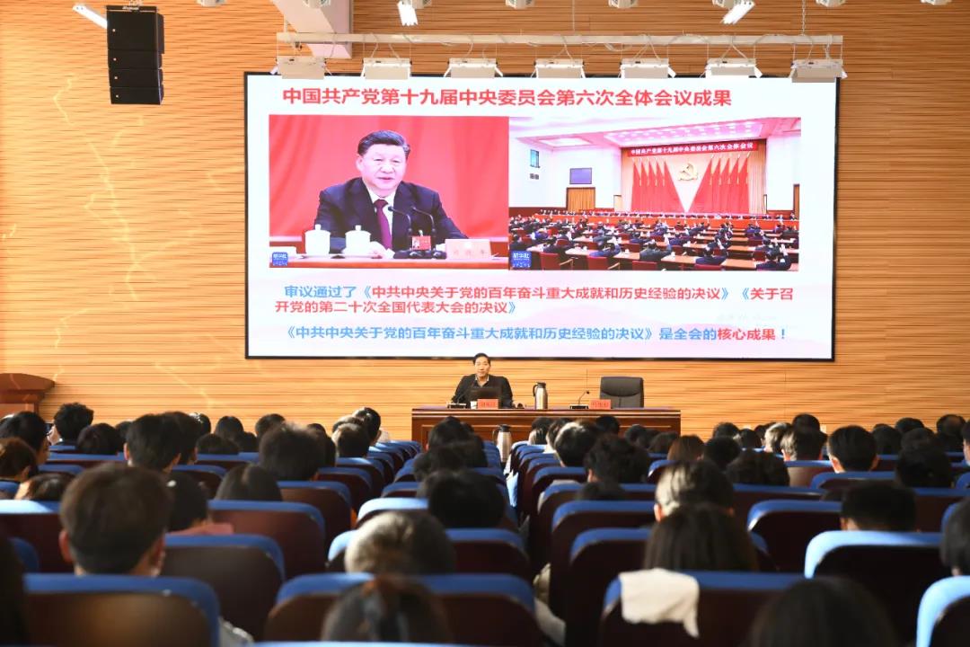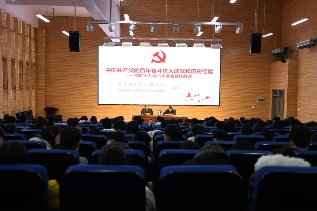 12月20日下午,省委宣讲团成员、河南科技大学马克思主义学院院长刘振江到我院宣讲党的十九届六中全会精神。学院党政领导班子成员、各党总支(直属党支部)书记、各部门负责人、思政课教师、专业课教师和学生代表现场聆听了报告会。党委委员、副院长马旭东主持报告会。
