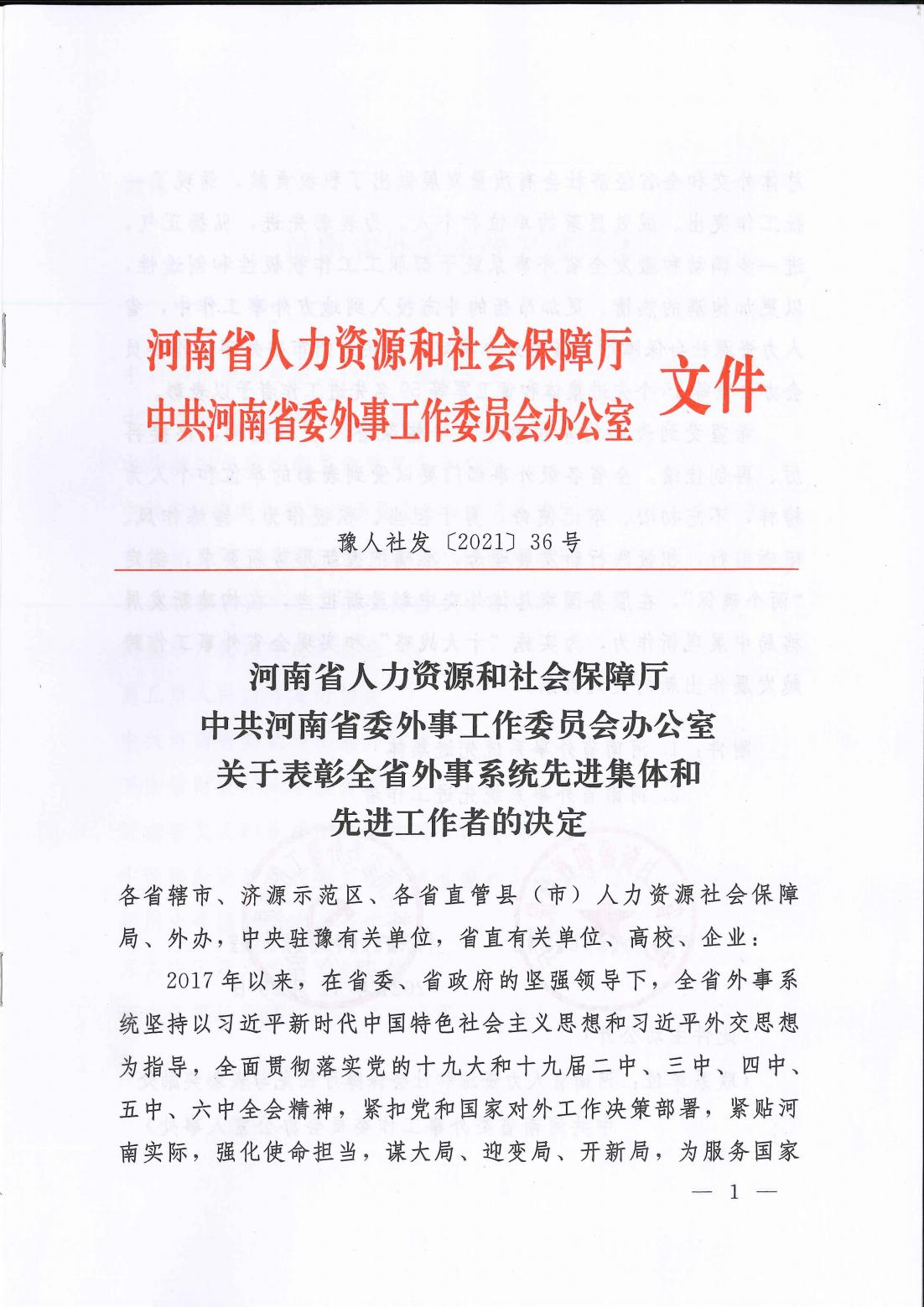 近日,河南省人力资源和社会保障厅、中共河南省委外事工作委员会办公室联合下发《关于表彰全省外事系统先进集体和先进工作者的决定》(豫人社发(2021)36号),我院教师霍焱获“河南省外事系统先进工作者”称号。