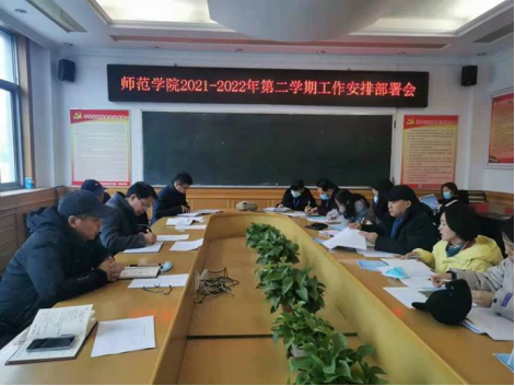 2月18日上午,师范学院在天鹅湖校区5204会议室召开2021—2022学年第二学期工作部署会。师范学院领导班子成员及各教研室主任参加会议。