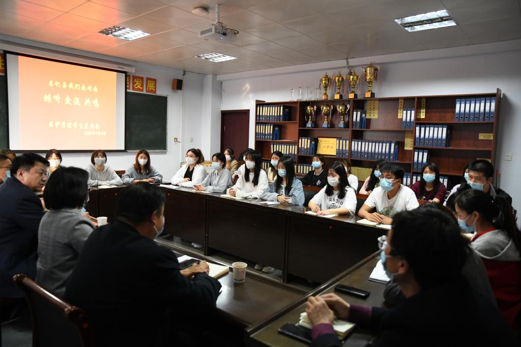 4月4日下午,党委书记杨彤到医护学院,与分包联系班级—医护学院2021级助产专业学生座谈交流,了解学生在学院期间的学习和生活情况,倾听学生对学院工作的意见和建议。党委委员、组宣部部长侯玲玲,党政办主任雷旭锋,医护学院院长张弛,党总支书记杨丽波陪同参加座谈会。