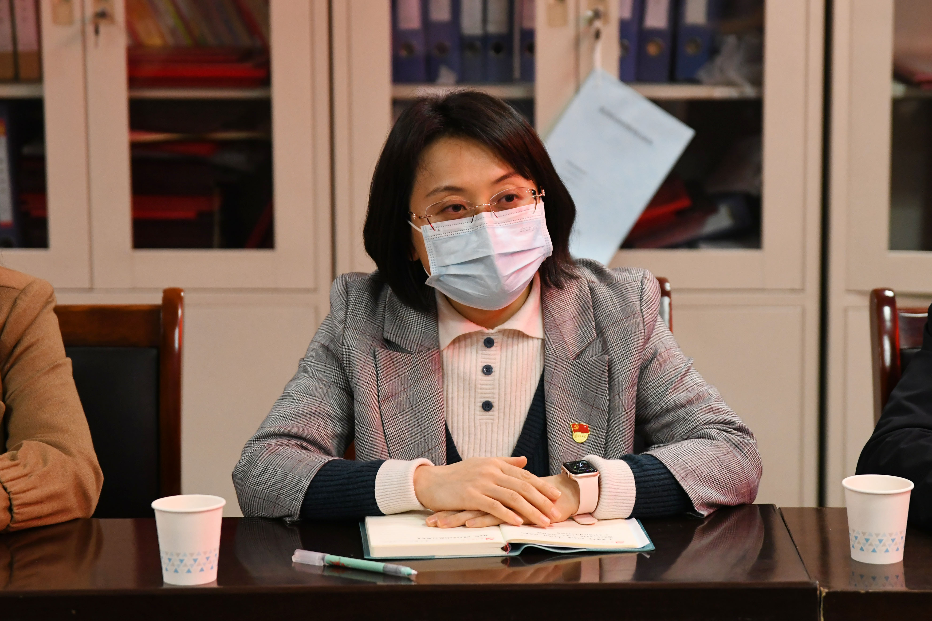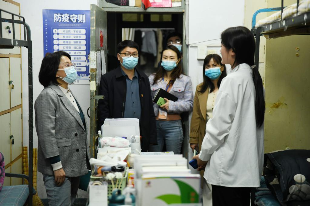 座谈会后,与会党员分组到学生宿舍查看疫情防控措施落实情况,与学生交流谈心。