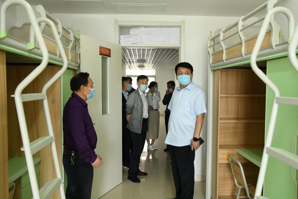 杨彤一行先后深入两个校区的学生报到现场、餐厅、学生公寓、教学楼、图书科技大楼等重点场所。每到一处,杨彤都认真听取各部门负责人的工作汇报,询问工作开展情况,逐一了解新生报到流程、学生安全教育、教学准备、校门管控、设施改造、物资储备、后勤保障及校园安全管理等情况,对相关工作提出指导意见和明确要求。