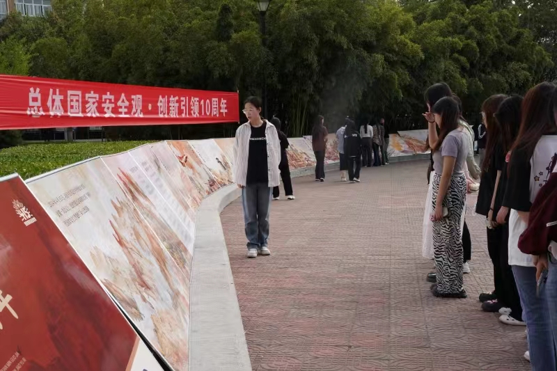 4月15日下午,在天鹅湖校区“4·15全民国家安全教育”主题活动现场,29块宣传展板依次排开,以图文并茂的形式多维度、全景式地展示国家安全教育知识,志愿者现场发放《“4·15”全民国家安全教育手册》,为8000余名学生讲解国家安全法规,引导青年学生牢固树立总体国家安全观,增强国家安全意识,严守国家安全有关规定,自觉履行维护国家安全义务,为筑牢祖国安全稳定屏障作出应有贡献。