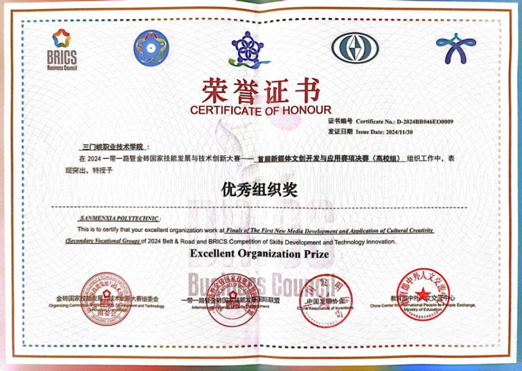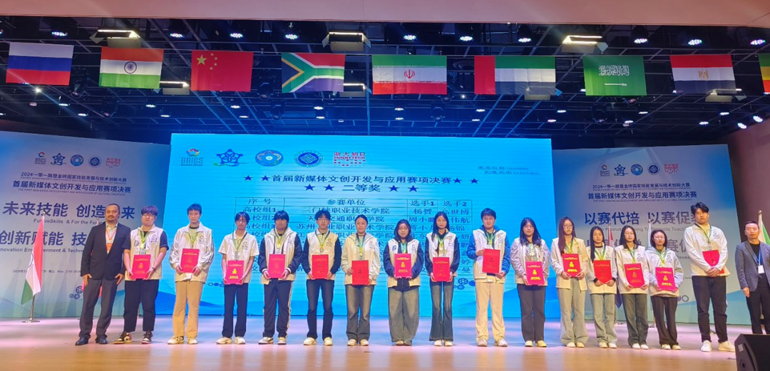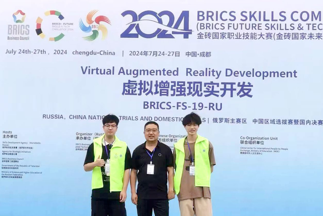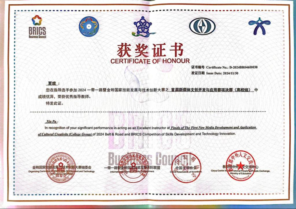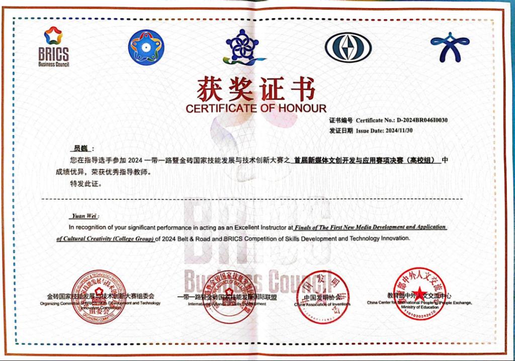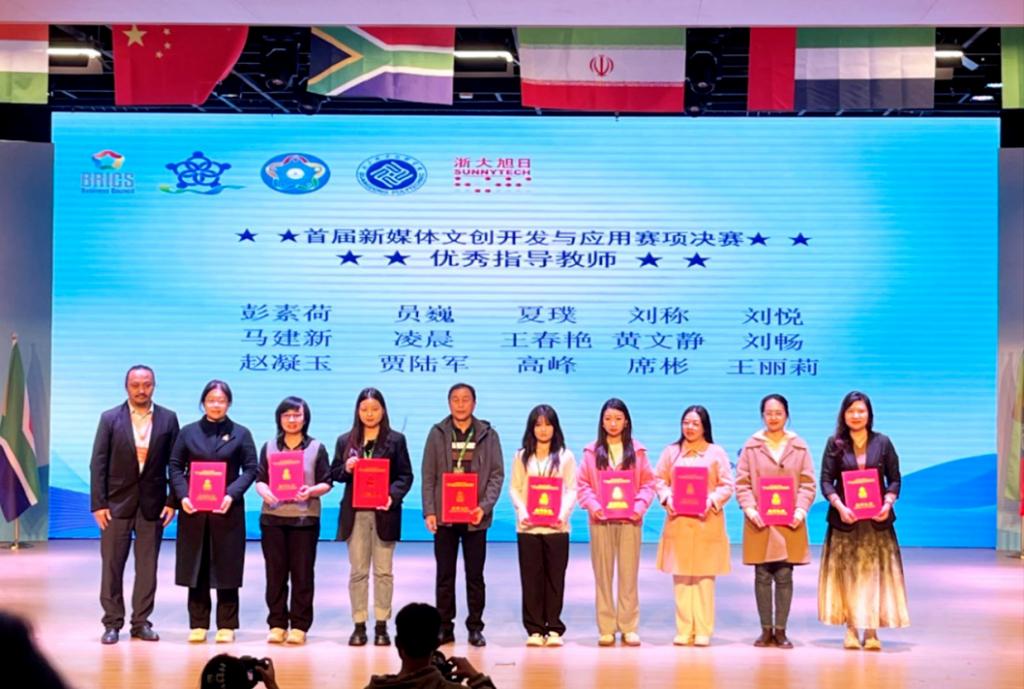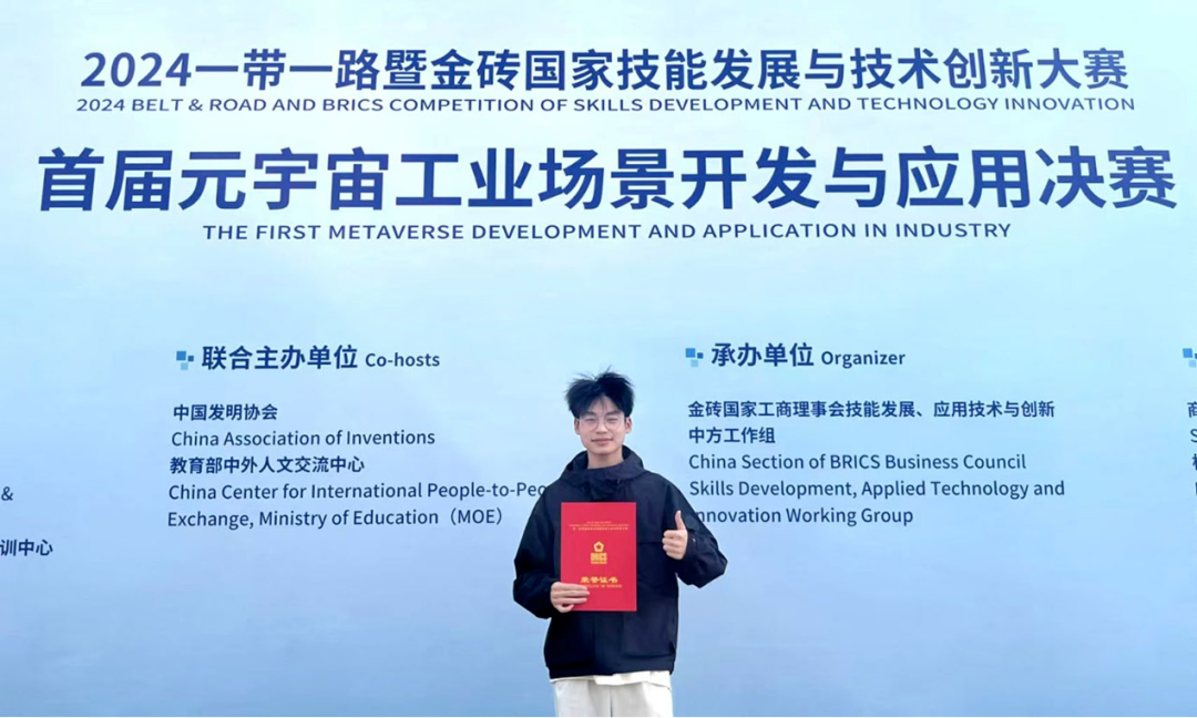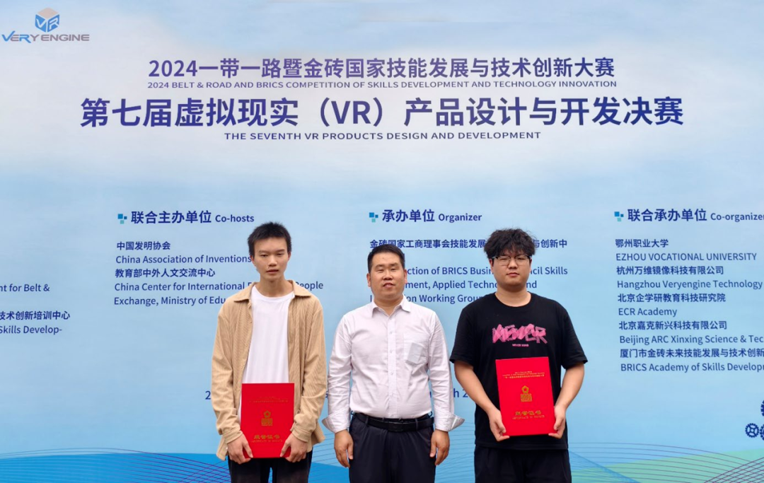11月30日,2024一带一路暨金砖国家技能发展与技术创新大赛--首届新媒体文创开发与应用赛项全国总决赛在广东举行。经过层层选拔,共有99支队伍、近200名选手进入最终对决。信息传媒学院2022级虚拟现实技术专业学生杨贇、高世博最终以总成绩第五名的优异成绩,荣获全国总决赛(高校组)二等奖(银奖),学院荣获“优秀组织奖”,员巍、夏璞两位指导教师荣获“优秀指导教师”。