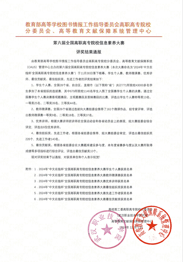 近日,由教育部高等学校图书情报工作指导委员会高职高专院校分委员会、高等教育文献保障系统(CALIS)管理中心主办的第六届全国高职高专院校信息素养大赛圆满落幕,学院荣获“最佳组织奖”,自赛事启动以来,图书馆广泛发动,积极组织学生参赛备赛,共有200余名学生参加了校内选拔赛。