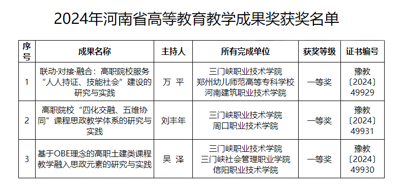 近日,河南省教育厅发布了《关于公布2024年度河南省高等教育教学成果奖获奖项目名单的通知》(教高〔2024〕363号),我院7个项目全部通过2024年河南省高等教育教学成果奖认定,荣获一等奖3项、二等奖4项,获奖数量创历史新高。