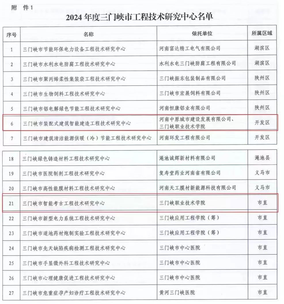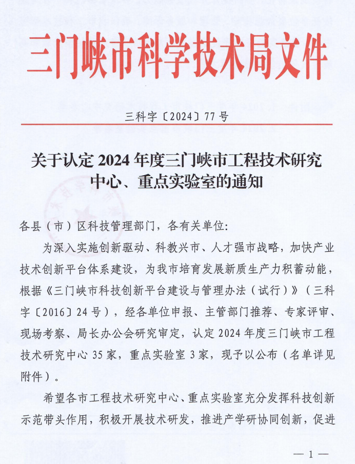 近日,三门峡市科技局发布《关于认定2024年度三门峡市工程技术研究中心、重点实验室的通知》,我院单独和或联合其他单位申报2家市级工程技术研究中心,在经过一系列严谨的程序,包括申报材料填写、专家审核、项目汇报以及现场考察之后获得认定。