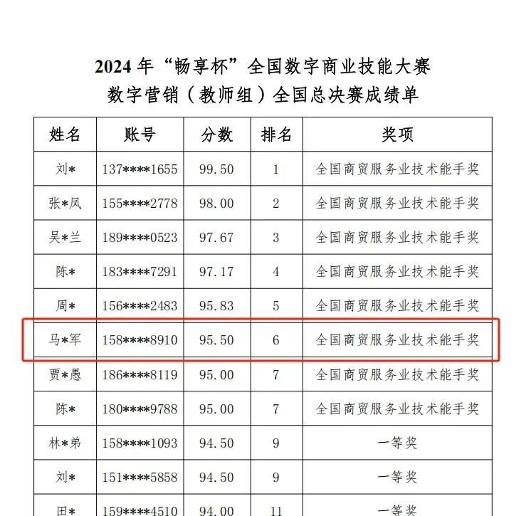近日,2024年“畅享杯”全国数字商业技能大赛数字营销赛项(教师组)全国总决赛圆满落下帷幕。经济管理学院教师马红军凭借扎实的专业技能,经历多轮淘汰赛后成功晋级总决赛,最终从全国80余名中职、高校教师中脱颖而出,以全国第六名的优异成绩获得“全国商贸服务业技术能手”奖。