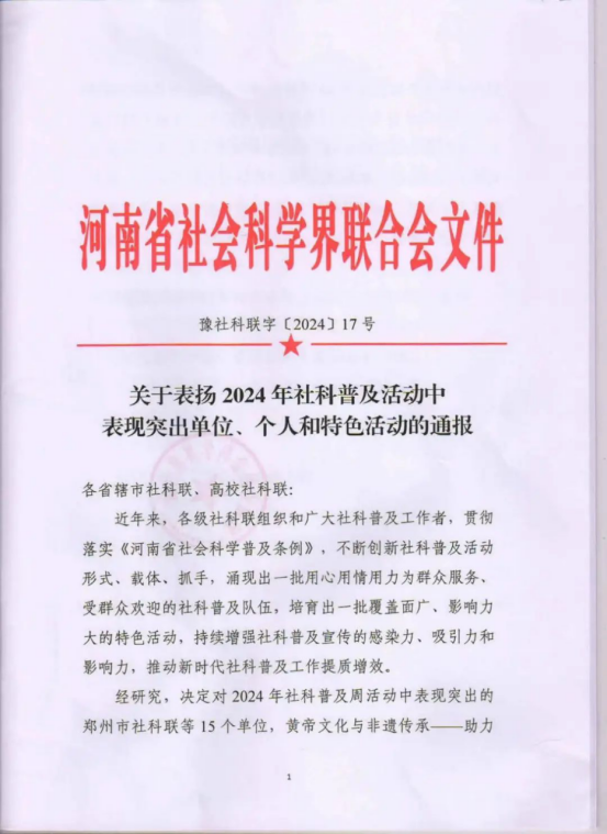 近日,河南省社科联印发了《关于表扬2024年社科普及活动中表现突出单位、个人和特色活动的通报》(豫社科联字〔2024〕17号),由我院报送的“用爱温暖 用心守护——志愿服务我在线”志愿服务项目,凭借出色的志愿服务成效与社会科普价值,成功获评河南省社科联社会科普志愿服务活动优秀项目。