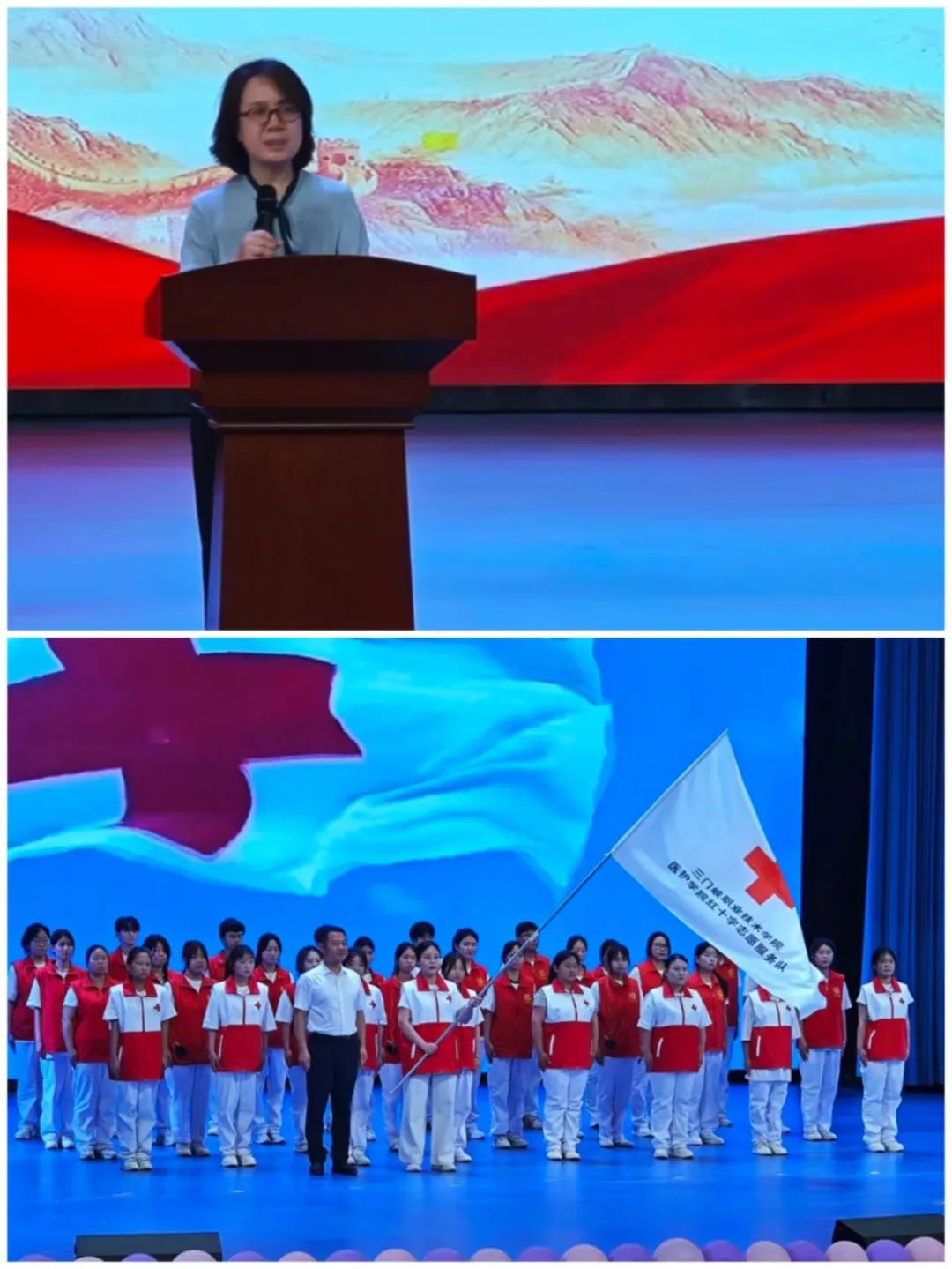 为传承南丁格尔精神,培育新时代护理人才,5月8日,学院在学术报告厅举行“仁心筑梦 护佑未来”国际护士节纪念活动暨红十字志愿服务队成立仪式。学院党委副书记高超杰,党委委员、副院长黄世谋,三门峡市红十字会和学院相关部门负责人、部分企业代表出席活动。医护学院党政负责人、全体教职工及护理专业学生代表共1200余人参加活动。活动由医护学院党总支书记张弛主持。