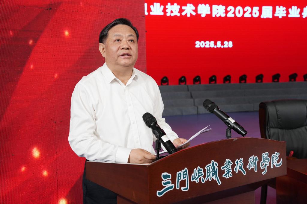 院长颉潭成在毕业典礼上致辞,向全体毕业生致以诚挚的祝贺和美好的祝愿,向辛勤培育、支持和帮助学生成长的老师、家长致以最诚挚的问候和最真诚的敬意。他指出,2025届毕业生和学院血脉相融、同舟共济,共同推进了一系列变革性实践,实现了一系列突破性进展,留下了一串串令人瞩目、让人欣喜的成长足迹。2025届毕业生中,有798名同学顺利通过专升本考试,继续求学深造,267名同学携笔从戎,投身军营,以许科举、安冉同学为代表的优秀毕业生在赛场上拼搏进取,为学院赢得了沉甸甸的荣誉,学院男、女篮球队用拼搏追逐梦想,以骄人成绩展现三职学子敢于拼搏、敢于胜利的“精气神”……这些闪光的时刻,凝聚成三职院人的共同记忆,希望同学们带着这份拼搏精神,在未来书写更精彩的人生篇章!