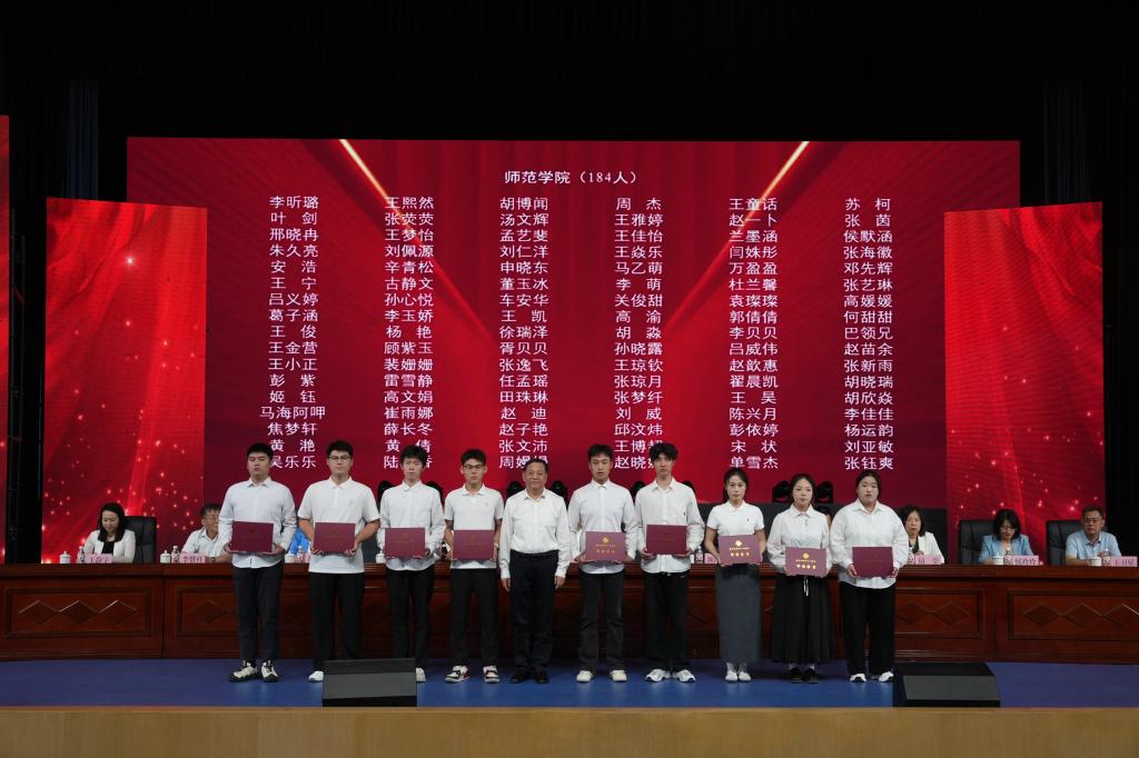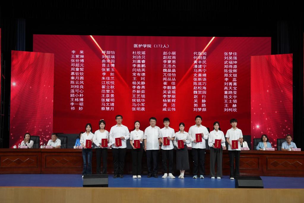 党委书记杨彤为优秀毕业生代表颁发荣誉证书并合影留念,勉励他们再接再厉,在未来的人生道路上再创佳绩。