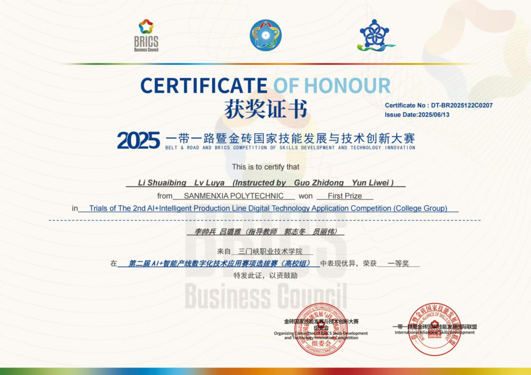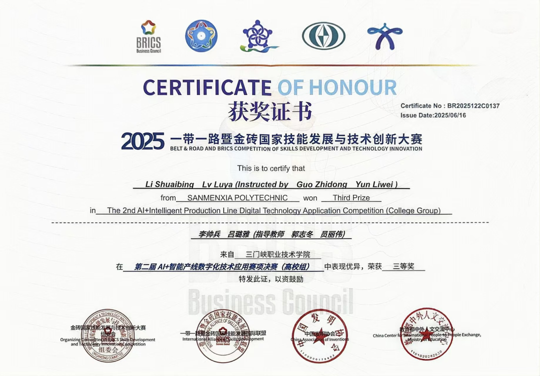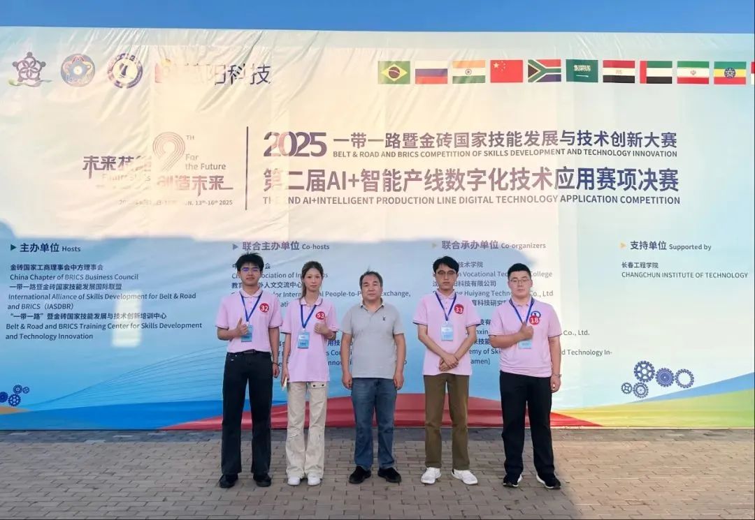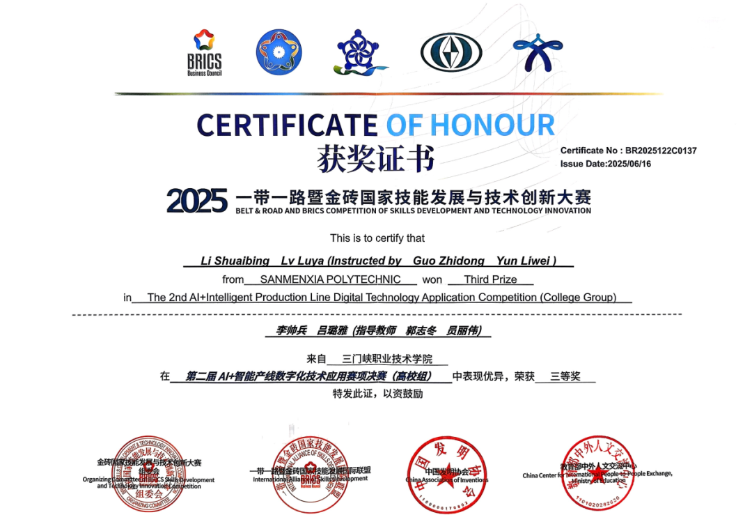 由金砖国家工商理事会中方理事会举办的2025一带一路暨金砖国家技能发展与技术创新大赛——“AI+智能产线数字化技术应用”赛项完美落幕。智能制造学院潘文凯、张博宇、李帅兵、吕璐雅组建的代表队,在指导老师刘志强、尤向阳、郭志冬、员丽伟的精心指导下,经过激烈角逐,凭借扎实的专业技能,在众多参赛选手中脱颖而出,荣获该赛项的三等奖两项。