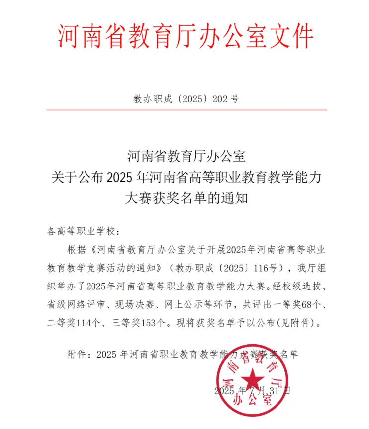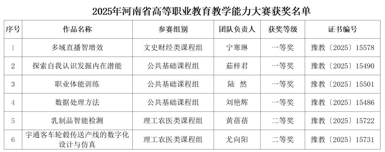近日,河南省教育厅发布了《关于公布2025年河南省高等职业教育教学能力大赛获奖名单的通知》。全省670支参赛团队同台竞技,我院选派的6支教学团队凭借扎实的教学功底和创新的教学设计,全部荣登榜单,勇夺一等奖4项、二等奖2项,综合排名高居全省第二。这一佳绩的取得是我院持续深化教育教学改革、着力提升教师队伍综合素养的生动体现,更是学院对标职业本科办学条件、扎实推进“双高”建设的重要阶段性成果。