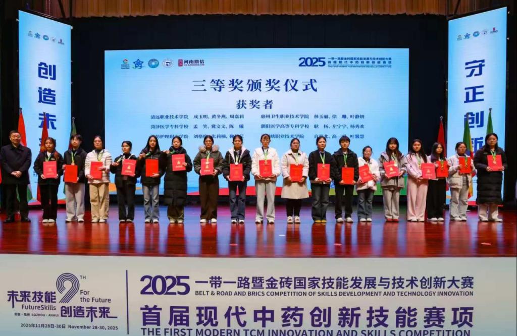 11月30日,一带一路暨金砖国家技能发展与技术创新大赛首届现代中药创新技能赛项全国总决赛在安徽亳州圆满落幕。医护学院中药学专业直光北、高一明、叶馨慧三位同学组成的参赛队伍,在指导教师李晔、倪志龙的全程护航下,凭借扎实的专业积淀、亮眼的创新思维与稳健的临场表现,从全国众多优秀团队中突围,荣获全国高职组铜奖,为学院赢得殊荣!