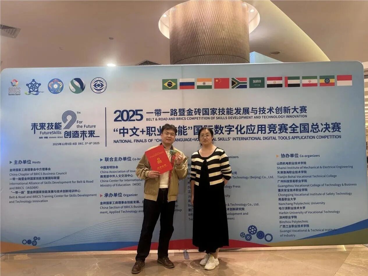 12 月 8 日,2025 “一带一路” 暨金砖国家技能发展与技术创新大赛之 “中文 + 职业技能” 国际数字化应用竞赛全国总决赛在博鳌亚洲论坛国际会议中心圆满落幕。学院酒店管理与数字化运营专业学生李程宇凭借扎实的专业功底、出色的现场表现及娴熟的数字化应用能力,在激烈角逐中脱颖而出,荣获全国组铜奖。