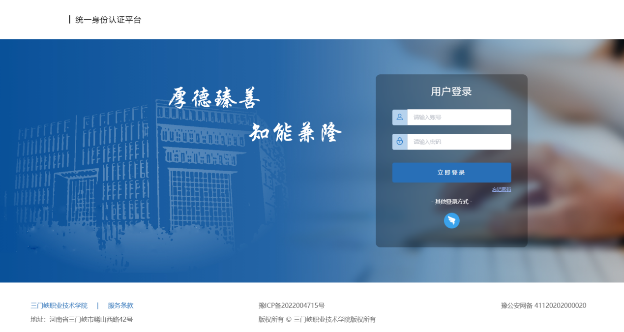点击右上角“登录”按钮,如图所示,在弹出的学校统一身份认证登录页面输入统一身份认证账号和密码登录(用户名为学工号、初始密码为身份证后六位)