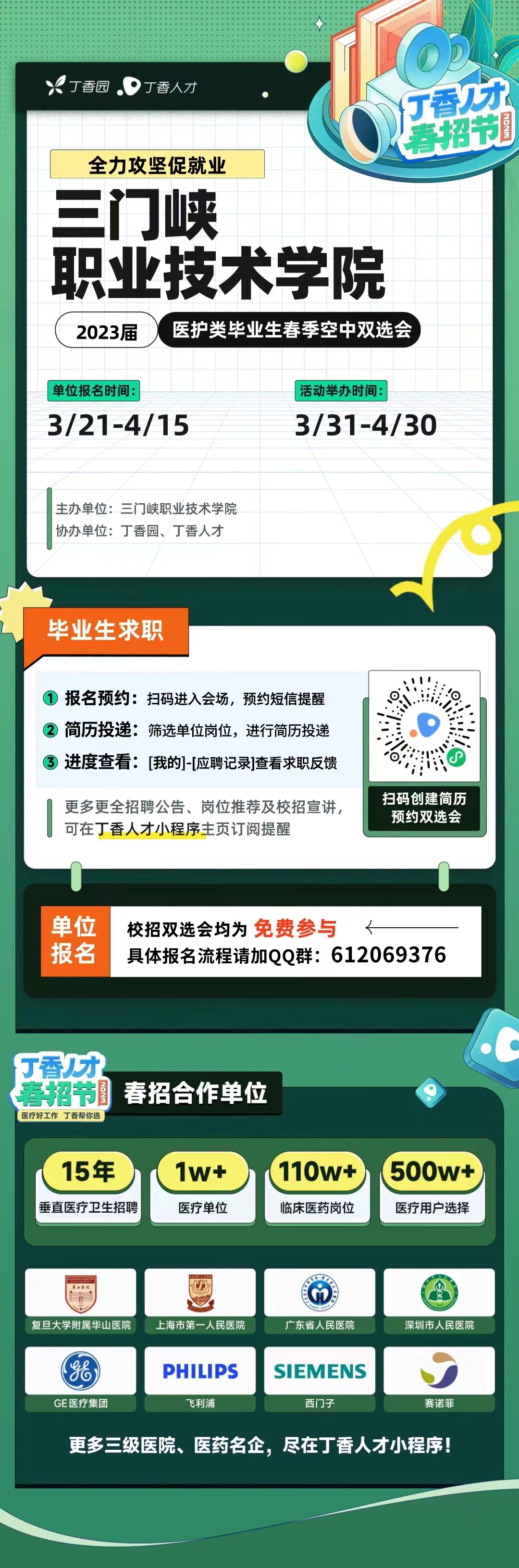 为深入贯彻党中央、国务院关于“稳就业、保就业”重要决策部署,促进高校毕业生更高质量充分就业。bcw8白菜网-2026白菜网总站大全|百富白菜网|海博论坛|白菜全网担保平台曝光官网定于近期联合丁香人才举办bcw8白菜网-2026白菜网总站大全|百富白菜网|海博论坛|白菜全网担保平台曝光官网2023届医护类毕业生春季空中双选会,搭建用人单位和毕业生线上双选交流平台。我校2023届医护类毕业生1800余人,现诚挚邀请各用人单位参加此次空中双选会,遴选优秀人才,助力企事业单位长远发展,现将有关事项安排如下: