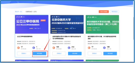 3.点击企业管理后台左侧“高校双选会”,选择需要报名的高校招聘会场次进行报名(新注册用户自动进入招聘会报名页面)