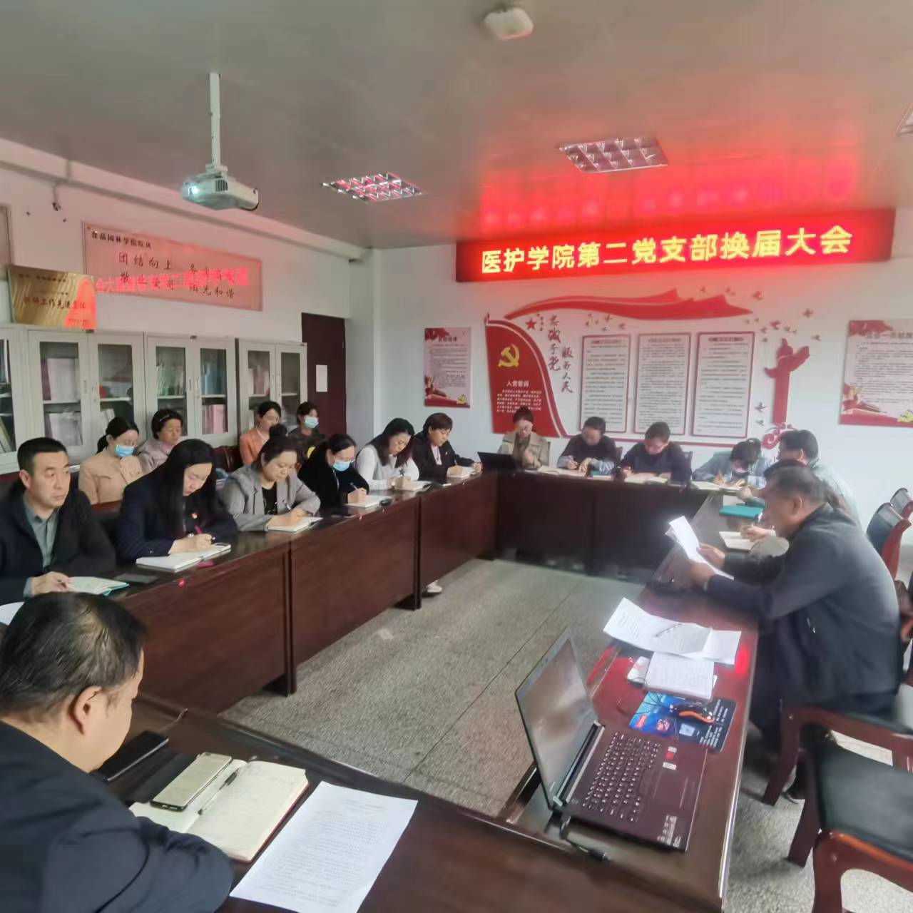 会议在庄严的国歌声中拉开帷幕,,参会人员庄严肃立,齐唱国歌。会上听取和审议了教学党支部书记郭宝厚同志代表本届支部所作的工作报告,宣读了宣读了选举办法。大会提议郝春霞、刘艳芳同志为大会监票人,王慧、宁燕同志为大会计票人,全体党员讨论后举手表决一致通过,播放了候选人名单和候选人基本情况。随后,支部换届选举正式开始,由计票人清点到会正式党员人数,向大会报告监票人,验票后分发选票。秉承着公正、公平、公开的原则,每位党员经过深思熟虑后投下了自己神圣的一票,通过差额选举的方式,经过票数统计,任彦斋、郭进都、聂明秀、高静、岳琳5名同志当选为新一届医护学院教学党支部委员会委员。任彦斋同志代表新当选委员从加强学习、团结一心、干事创业、廉洁自律四个方面作了表态发言,新一届支委会后召开了第一次支委会议,任彦斋同志当选为教学党支部书记。医护学院党总支书记张弛同志作了总结讲话,对新一届党支部的建设提出了殷切希望和明确要求。大会在《国际歌》声中结束。