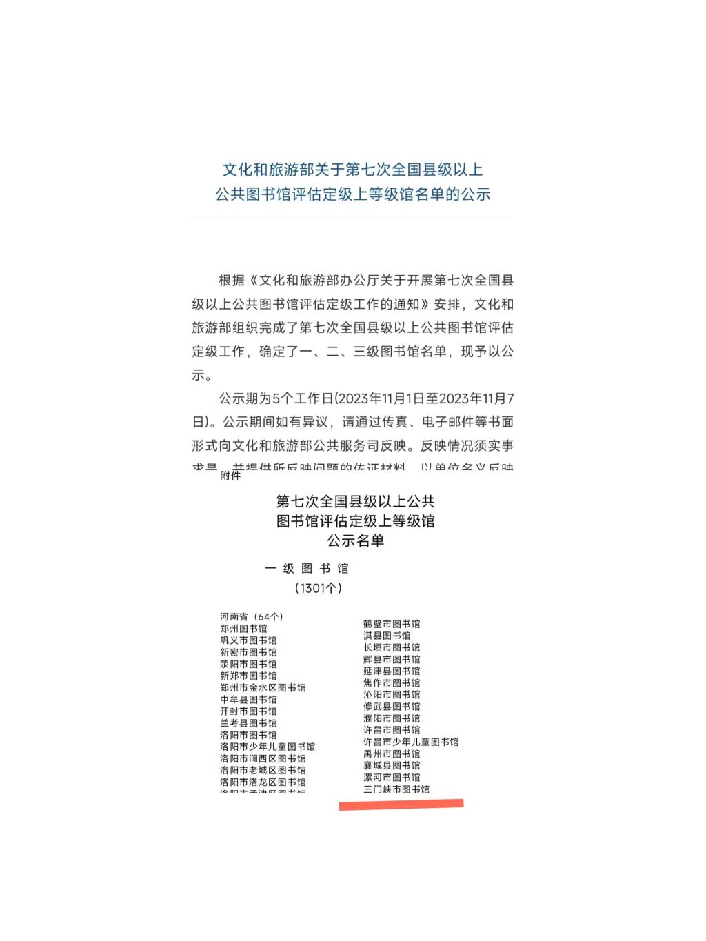 日前,从文化和旅游部办公厅公布的《文化和旅游部关于第七次全国县级以上公共图书馆评估定级上等级馆名单的公示》上获悉,我校图书馆获得了“一级图书馆”称号,这是依据第七次全国县级以上公共图书馆评估标准和定级必备条件。经过评估、公示等环节,确定全国2722个公共图书馆达到三级以上公共图书馆标准。其中,首都图书馆等1301个公共图书馆被评为“一级图书馆”,我校图书馆也名列其中。
