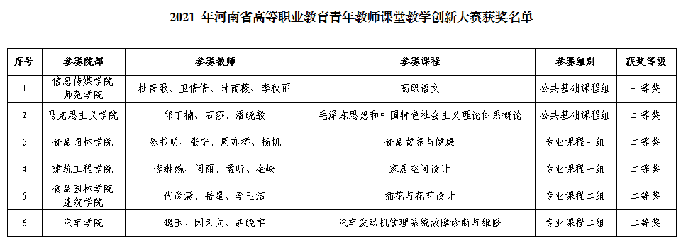 近日,河南省教育厅印发了《关于公布2021年河南省高等职业教育青年教师课堂教学创新大赛获奖名单的通知》(教职成〔2021〕501 号)文件,我院6支参赛团队全部获奖,其中荣获一等奖1项、二等奖5项。