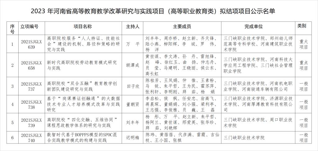 近日,河南省教育厅发布《关于公布2023年河南省高等教育教学改革研究与实践项目(高等职业教育类)拟结项项目的公示》,我院6个立项项目通过结项鉴定。为我院的教学改革研究起到积极的示范引领作用,同时也促进了我院教改成果的推广和共享。