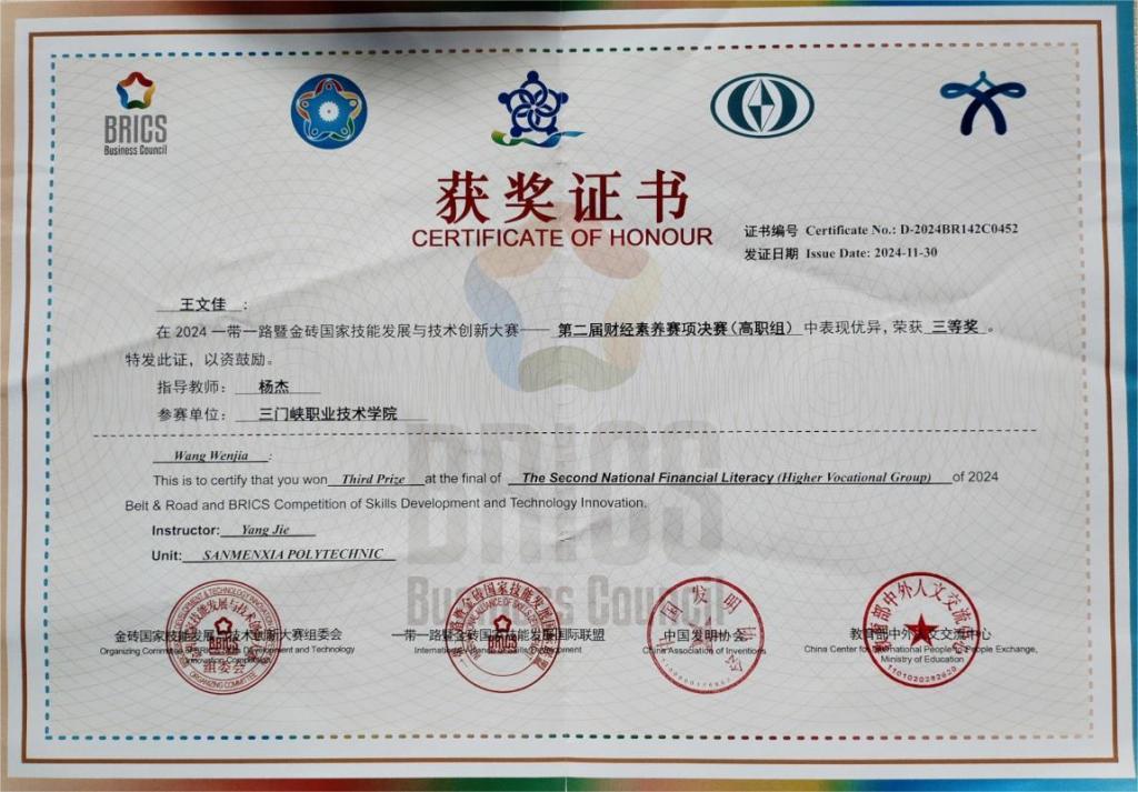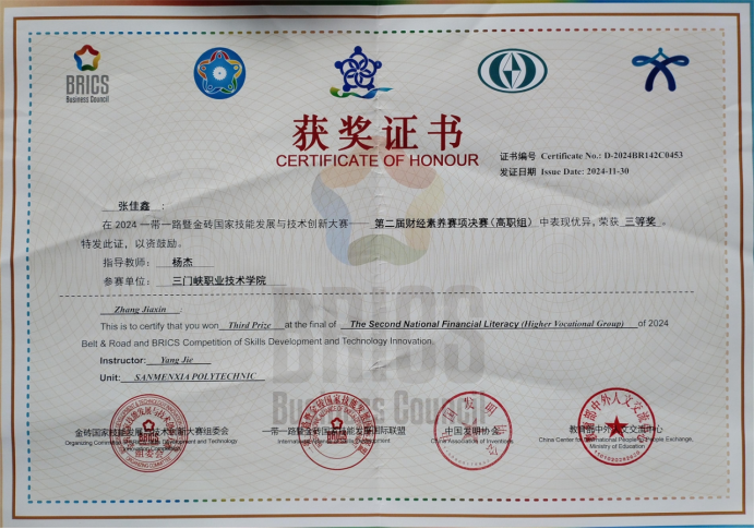 近日,2024一带一路暨金砖国家技能发展与技术创新大赛之第二届财经素养技能赛项(高职组)国内赛总决赛在云南财经职业学院圆满落幕,我院参赛选手王文佳和张佳鑫同学在杨杰老师的精心指导下,凭借卓越的专业技能和出色的心理素质,力克群雄,双双荣获国内组三等奖,这是经济管理学院在该赛事上的首次突破。