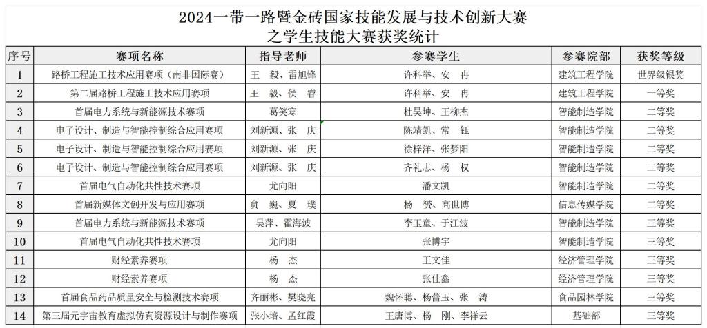 “一带一路暨金砖国家技能发展与技术创新大赛”自2017年学生技能大赛开赛以来,我院一直积极组织学生团队参赛,截止目前斩获学生国际赛二等奖(银牌)1项,国内赛一等奖1项、二等奖6项、三等奖6项,其中,建筑工程学院王毅、雷旭锋两位教师指导的道路与桥梁工程技术专业许科举、安冉两位同学在2024一带一路暨金砖国家技能发展与技术创新大赛(南非国际赛)路桥工程施工技术应用赛项中荣获银牌,展示了学院在人才培养、教学改革、专业建设、国际化办学水平等方面取得的优异成绩,推动了学院与南非国家院校的文化交流与技术合作。我院“一带一路暨金砖国家技能发展与技术创新大赛”学生技能竞赛获奖领域涵盖道路桥梁工程技术、新能源技术、食品药品检测技术、虚拟仿真信息技术、新媒体文创开发、电气自动化等多个专业。这种“师生同台竞技、教学相长”的生态,正是学院“竞赛育人”特色的集中体现。