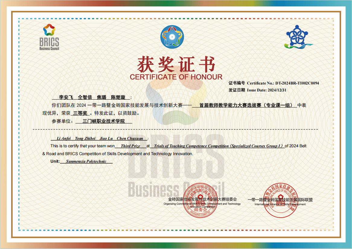 近日,2024“一带一路”暨金砖国家技能发展与技术创新大赛首届教师教学能力大赛选拔赛圆满落幕。我院教师李安飞、仝智倍、焦璐、陈楚璇团队凭借卓越的教学设计与实践能力,荣获该赛项(专业课一组)三等奖的佳绩。