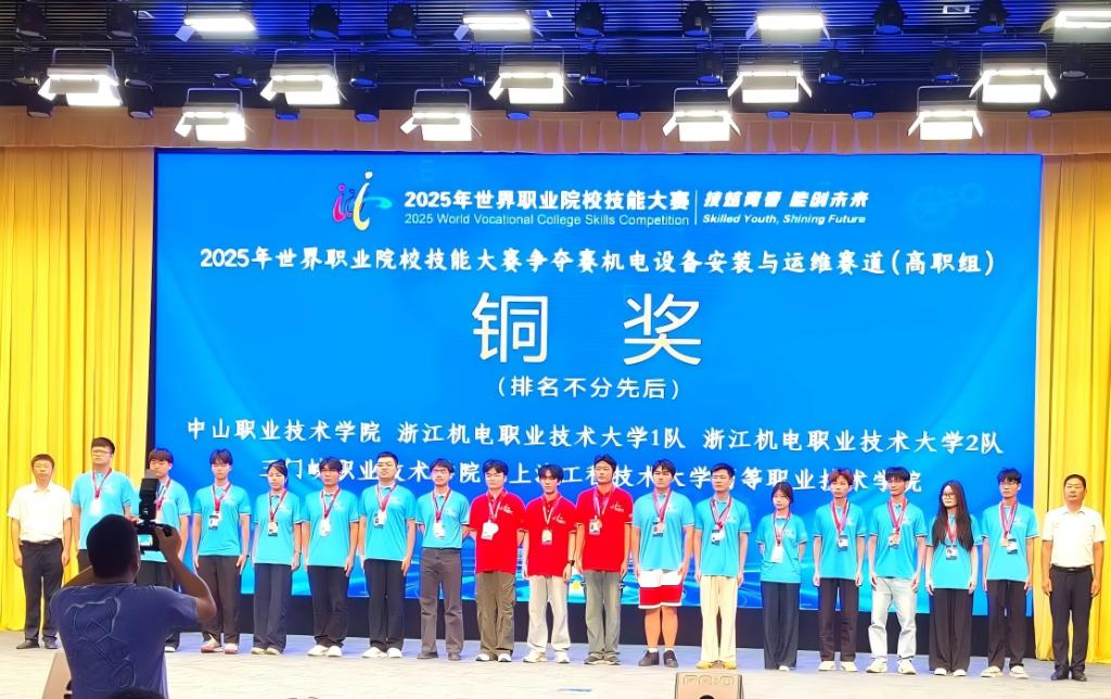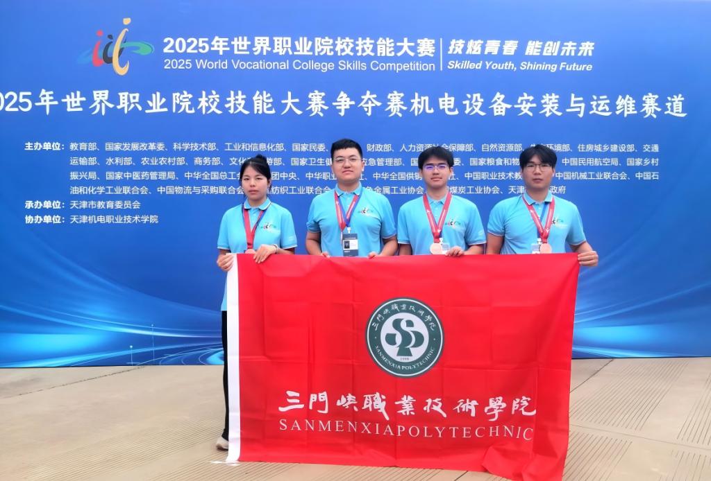 9月18日-22日,2025年世界职业院校技能大赛总决赛争夺赛“机电设备安装与运维”赛道在天津机电职业技术学院落下帷幕。由智能制造学院尤向阳和汽车学院雷楠楠主要指导,2023 级电气自动化技术专业李帅兵、于江坡、杜昊坤和2024级风力发电工程技术专业孙一四位同学组建的“智能光伏并网控制系统安装与运维”参赛团队与来自全国83所高职院校的90支代表队同台竞技,表现卓越,喜获铜奖,实现学院在世界职业院校技能大赛工科赛项的历史性突破。