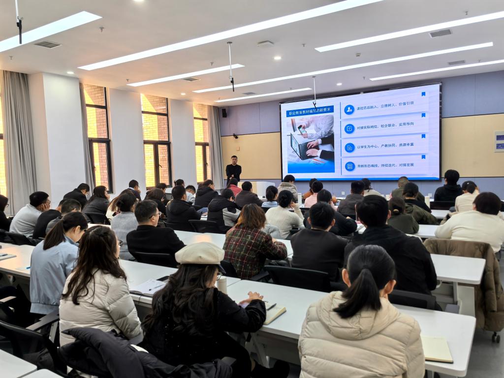 培训会上,杨璠以《职业教育教材的编写与规划申报》为主题,从职教教材百年发展历程切入,系统阐述了新时代教材建设的意义与方向。结合我院入选国家规划教材的典型案例,杨璠重点讲解了“岗课赛证”综合育人、校企协同开发、课程思政有机融合等编写原则,剖析了活页式、工作手册式、融媒体教材等新型形态的开发路径。他还围绕教材出版全流程,强调了意识形态把关、知识产权保护与编校质量保障等关键环节,并针对“十四五”规划教材申报的政策要求、材料组织与评审重点,给予了细致指导。
