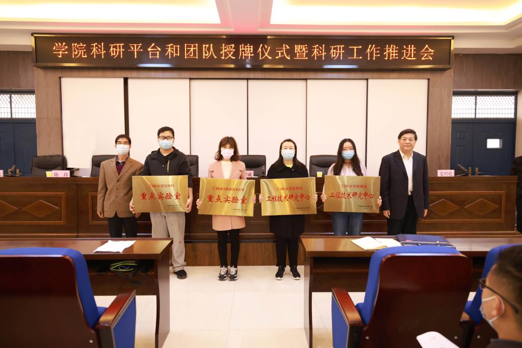 杨占江宣读了依托我院申报的4个市级科研平台批准建设文件。学院科研处处长陈玮教授宣读了3个校级平台、8个校级科研创新团队批准成立文件;宣读文件后,与会领导为新成立的科研平台、团队授牌,并与接牌代表合影留念;三门峡市黄河湿地环境过程与生态修复工程技术研究中心负责人官庆松博士代表平台做了发言。