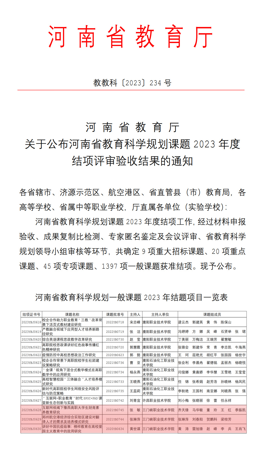 近日,河南省教育厅公布了河南省教育科学规划课题2023年度结项评审验收结果,根据《河南省教育厅关于公布河南省教育科学规划课题2023年度结项评审验收结果的通知》(教教科〔2023〕234 号 ),经过材料申报验收、成果复制比检测、专家匿名鉴定及会议评审、省教育科学规划领导小组审核等环节,我院申报的3个一般课题顺利结项。
